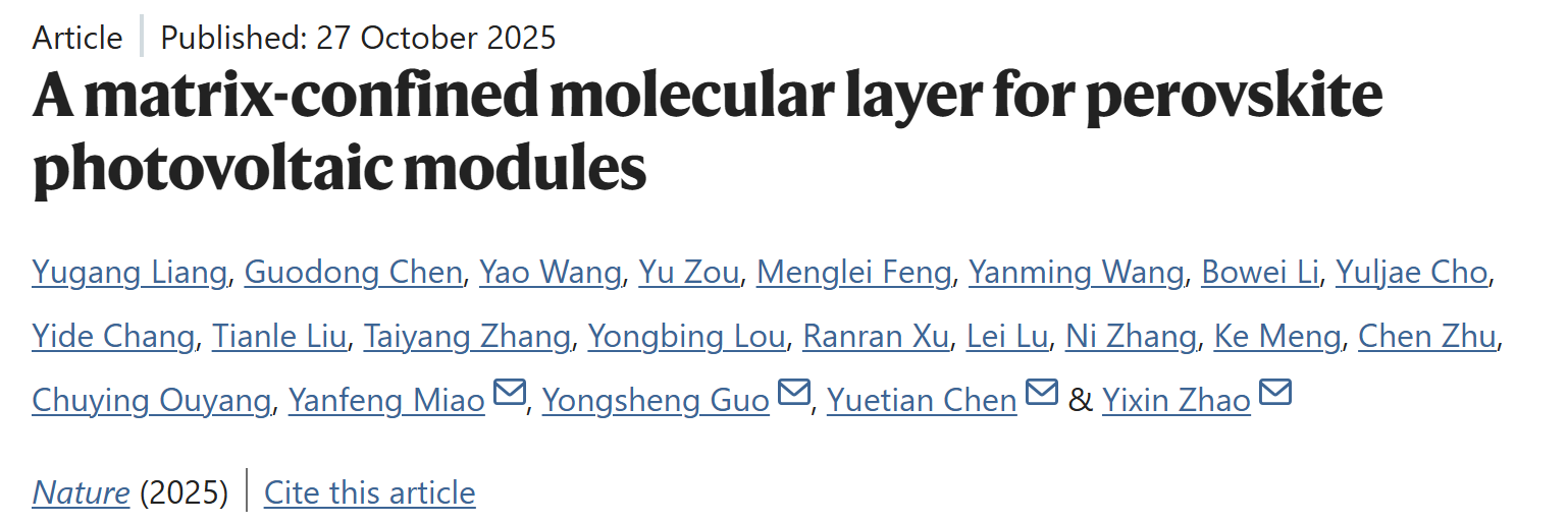 Nature发文!日本女优 赵一新团队“基质限域分子层”型电荷传输层设计实现高效率大面积钙钛矿光伏模组