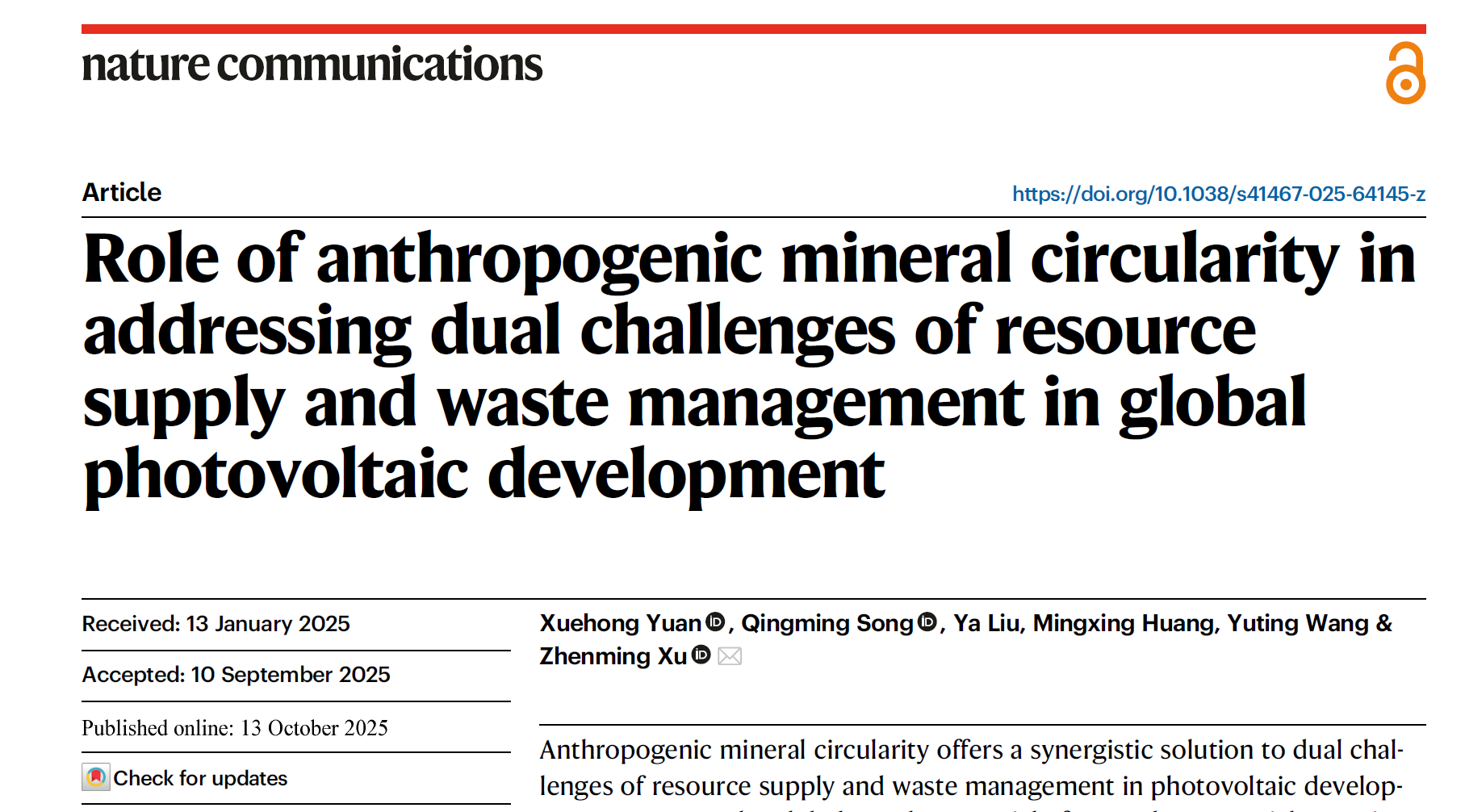 环院智慧|许振明教授团队Nat. Commun.发文量化人为矿物循环在全球光伏发展中应对资源供应与废物管理双重挑战的作用