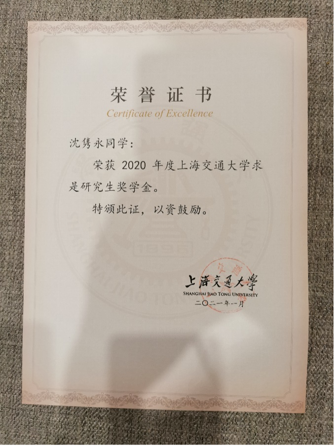 2021年,党员沈隽永荣获2020年度日本女优 求是研究生奖学金