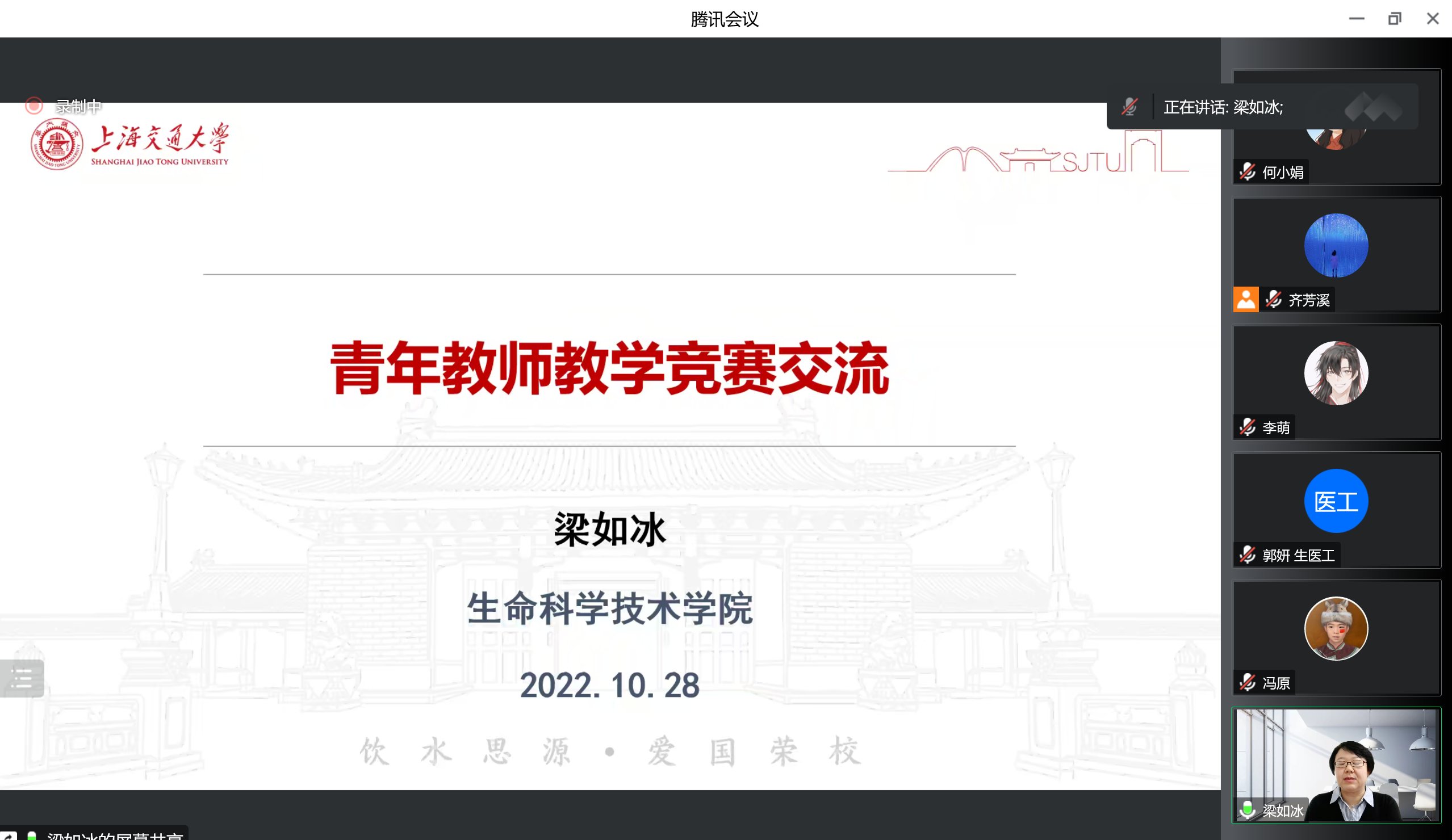 梁如冰回顾和梳理了自己作为一名教学新手备战青教赛的历程。她认为,参加教学比赛对于青年老师来说,是一个非常好的锻炼机会。在备赛过程中她得到来自学校、教发中心和学院的大力支持,得到教学名师、教育教学研究专家的全面指导。不仅对课程内容重新进行了细致梳理、凝练和再提升,教学逻辑性系统性增强,而且个人教学理念和教学技巧也有了质的飞跃,个人教学水平得到了全方位提升。梁如冰以参赛课程《微生物的世界》为例,详细介绍了教学内容选择要注重学术性和饱满度,教学设计要考虑完整性,注重课程思政与教学内容的有机结合,灵活运用教学方法,充分调动学生思维和参与度,巧妙设计板书等,并对课堂教学展示环节和教学反思环节的具体内容进行了分析。她通过“病毒的进化与流行”这一参赛节段的展示,形象模拟了比赛现场。梁如冰建议参赛选手应多参加教学培训,不断完善教学方法和技巧;通过分段试讲、实战模拟,逐渐积累经验;并不断通过专家指点和同伴交流,反复打磨,精益求精。她希望每位老师都能享受比赛的过程,立足教书育人的根本,站好三尺讲台。