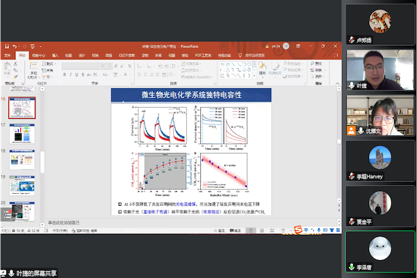 在交流讨论环节,与会师生就“PLA微塑料粒径尺度效应”、“材料-微生物界面电容贡献率”、“厌氧光电产甲烷过程中的氢气生成”、“光生电子产甲烷能量转化效率”等问题与叶捷进行了深入交流,线上互动气氛热烈。