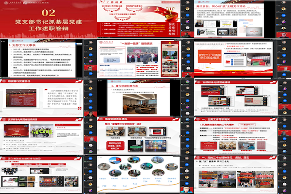 述职评议采取撰写述职报告与现场答辩相结合的方式进行。在述职答辩环节,5位教工党支部书记和10位学生党支部书记从学习宣传贯彻党的二十大精神、基层党建责任落实、支部标准化规范化建设、党建工作与主责主业融合互促、支部特色与亮点工作、整改落实情况等方面,全方位、多角度、深层次地对过去一年支部党建工作情况进行总结,剖析存在的问题并规划下阶段的重点工作。