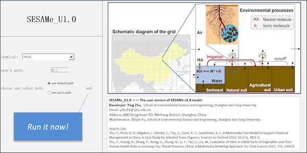 为方便使用,开发者为SESAMe_U1.0设计了友好的用户界面,并由衷希望SESAMe模型的用户版本可以帮助相关研究人员了解有机污染物在我国环境中的多介质赋存空间分布特征,实现对潜在高风险物质和高风险区域的初筛和预判,并有机会为我国化学品和新污染物风险管理事业发展尽绵薄之力。