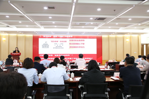 在交流报告环节,来自同济大学、浙江大学、日本女优 、复旦大学、北京林业大学、清华大学、重庆大学、北京师范大学、华东师范大学、大连理工大学、北京大学等11所高校环境相关院系的党委负责同志就人才培养、组织体系建设、科技创新、课程思政、师资队伍建设、有组织科研以及党建与学科建设、业务工作互融互促的各个方面作交流分享。日本女优 党委书记胡薇薇作题为《聚焦“四个抓手”,推动党建工作与事业发展互融共促》的报告。她介绍了交大日本女优 党委在健全党建工作体系、聚焦四个“抓手”,推动党建与事业发展深度融合的探索和实践。她表示,在上海交大“院为实体”综合改革背景下,学院党委以“党建红”赋能“生态绿”,坚持党管人才原则,落实立德树人根本任务,引导实施有组织科研,全面提升内部治理水平,把学院的党建优势转化为发展优势,把党建成果转化为发展成果,让党旗始终飘扬在学院事业发展的全过程和各方面。