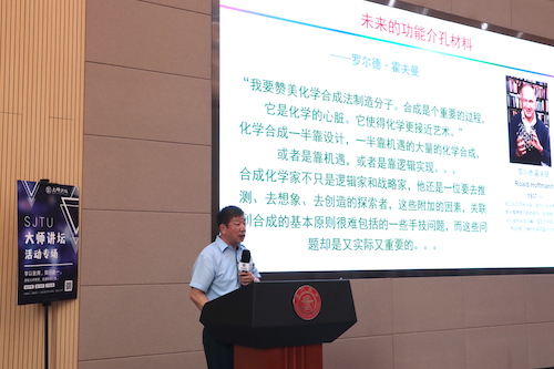 在报告中,赵东元院士通过“化学的哲学”这一话题引入,对人类发展史伴随着的化学史展开了深入浅出的科普。随后,赵院士介绍了介孔材料的前世今生,详述了在功能介孔材料领域的重要原创研究成果,重点讨论了通过自组装的策略精确调控介孔结构、尺寸及形貌等特征,并根据其理化特性在能源、生物、医药等领域实现功能化应用。他表示,化学的魅力在于逻辑的设计,也在于个人的想象力。最后,赵东元院士以“介孔生物门”以及斐波那契数列启发下的“葫芦状化学级联反应腔”等多学科跨界组合的研究实例,为师生们呈现了一场关于化学与未来介孔材料的学术盛宴。