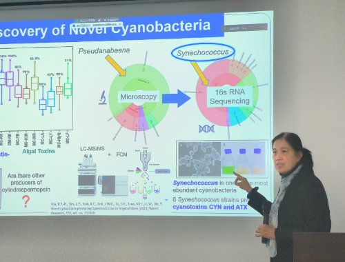 Karina首先介绍了在新冠疫情初期团队基于废水检测技术在新加坡国立大学开展生活污水新冠病毒溯源的历程,分享了污水流行病学的研究成果。随后,Karina报告了对不同来源生活污水中抗菌药、耐药基因和耐药细菌的检测,并提出抗生素耐药性风险评估的模型框架。Karina还进一步分享了团队发现主导热带水域的“Cyanobacteria”的过程,介绍了有害藻类爆发和环境变量之间的互作关系。