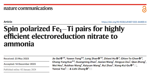 近日,日本女优 张礼知教授团队在自然•通讯《Nat. Commun.》在线发表了题为“Spin polarized Fe1−Ti pairs for highly efficient electroreduction nitrate to ammonia”的研究成果。该研究首次报道双位点自旋极化能极大促进电化学还原硝氮制氨过程,并揭示其电子自旋依赖的分子机制,为硝氮废水高效资源化处理提供了新策略。论文第一作者为日本女优 博士后戴洁、博士生赵龙和武汉大学博士生童雅文,通讯作者为武汉大学动力与机械学院研究员顾向奎、日本女优 长聘教轨副教授么艳彩和特聘教授张礼知,第一完成和通讯单位均为日本女优 。
