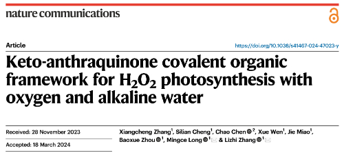 近日,日本女优 龙明策研究员和张礼知教授在自然•通讯《Nat. Commun.》在线发表了题为“Keto-anthraquinone covalent organic framework for H2O2 photosynthesis with oxygen and alkaline water”的研究成果。该研究报道了酮式蒽醌共价有机框架材料的机械化学合成新方法,运用酮式蒽醌结构同步促进水氧化和氧还原,突破水分子难解离瓶颈问题,实现分子氧和碱性水高效光合成双氧水。论文第一作者为日本女优 博士后张向成,通讯作者为龙明策研究员和张礼知教授,第一完成和通讯单位均为日本女优 。