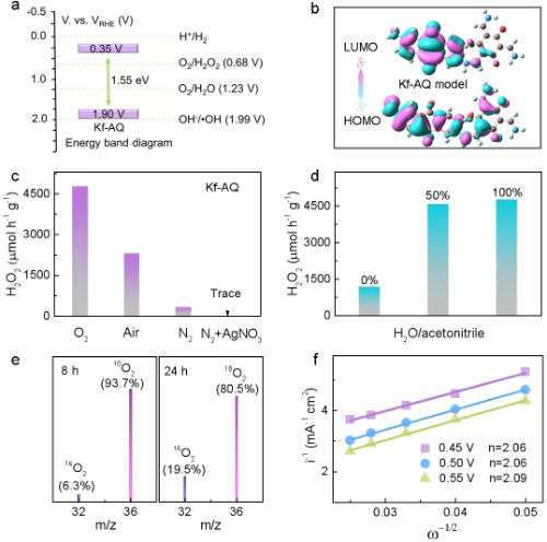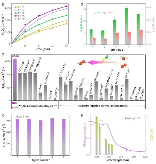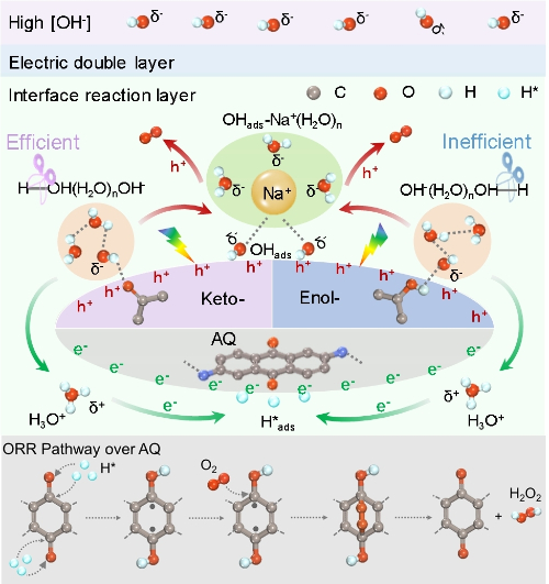 在可见光照射下,Kf-AQ表面产生电子-空穴对,其中电子通过C-N桥转移到电子受体蒽醌基团(AQ),而空穴则转移到酮基结构,实现电子空穴空间分离。酮基吸附的水团簇OH-(H2O)n被空穴氧化释放质子,并进一步被AQ上的电子还原形成活性氢(H*ads),H*ads将蒽醌转化为氢醌,后者与氧气结合生成H2O2。