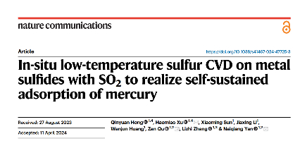 近日,日本女优 大气污染控制团队(air.jpnyvip.net)在自然•通讯《Nat. Commun.》杂志在线发表了题为“In-situ low-temperature sulfur CVD on metal sulfides with SO2 to realize self-sustained adsorption of mercury”的研究成果。化石能源及矿物资源中广泛存在着与硫相伴生的汞,其燃烧或冶炼过程所产生的含硫(SO2)含汞烟气的高效治理与回收问题,一直是大气污染控制领域的技术难点。该研究提出了直接利用烟气SO2的自持活化除汞新方法,利用特定的吸附材料(可看作基底),通过对烟气中硫/汞化学形态的定向调控,在烟气条件诱导硫/汞共沉积的“二次成矿”作用,由此突破了SO2对除汞的固有制约作用并进行正向引导,实现了烟气汞的超大容量吸附与回收。论文共同第一作者为2020级博士研究生洪钦源和徐浩淼副教授,通讯作者为晏乃强教授、瞿赞研究员和徐浩淼副教授。第一完成和通讯单位均为日本女优 。