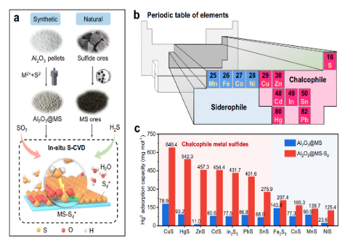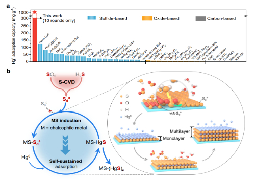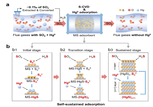 图1 金属硫化物上实现Hg0自持活化吸附的原位S-CVD策略