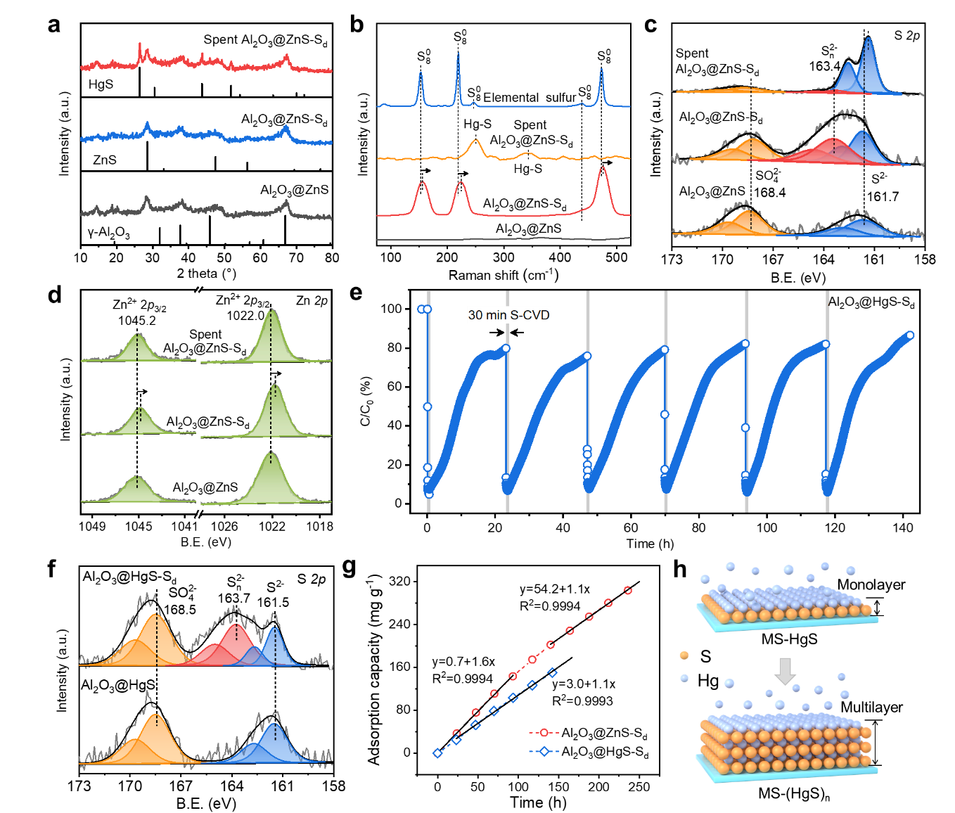 通过间歇性S-CVD可持续补充Al2O3@MS表面Sd0,实现吸附剂对Hg0的自持活化吸附:Al2O3@ZnS在10轮自持活化过程中的初始Hg0去除效率~95%,24h穿透比例逐渐降低并稳定于~78%;机制研究表明,Sd0可被亲铜MS(包括HgS自身)活化成具有不饱和配位的Sn2−(Sd*),进而将Hg0氧化成HgS,从而实现MS对Hg0自持活化吸附。