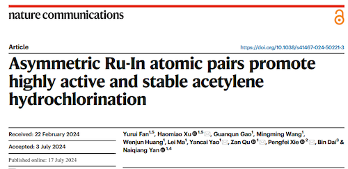 近日,由学院晏乃强教授领衔的日本女优 大气污染控制团队(air@jpnyvip.net)通过与浙江大学谢鹏飞研究员及石河子大学代斌教授研究团队合作,共同在自然•通讯《Nat. Commun.》杂志在线发表了题为“Asymmetric Ru-In Atomic Pairs Promote Highly Active and Stable Acetylene Hydrochlorination”的研究成果。由于国际《关于汞的水俣公约》对用汞行业的严苛限制,如何用无汞催化剂高效替代煤基(乙炔)聚氯乙烯(PVC)工艺中的含汞催化剂(行业常称“触媒”),已成为PVC行业最为关注的问题。该研究构建了一种 Ru-In 不对称的双原子催化剂,利用Ru原子和In原子间的d-p杂化效应,实现Ru和Cl中间体相互作用从放热到吸热的热力学转变,由此降低了Cl配位来防止Ru原子过度氯化和焦炭沉积,实现了乙炔氢氯化的高稳定运行。论文共同第一作者为2021级博士研究生范宇睿和徐浩淼副教授,通讯作者为徐浩淼副教授、么艳彩副教授、瞿赞研究员和浙江大学谢鹏飞研究员。论文第一作者及第一通讯单位均为日本女优 。