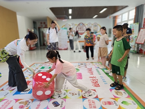 实践团成员与社区儿童共同参与垃圾回收趣味游戏