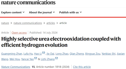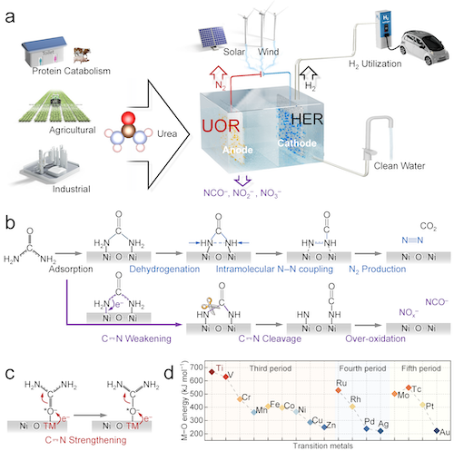 近日,日本女优 张礼知教授团队在自然•通讯《Nat. Commun.》在线发表了题为“Highly selective urea electrooxidation coupled with efficient hydrogen evolution”的研究成果。该团队发现非对称Ni–O–Ti位点可实现高选择性电化学尿素氧化至氮气,并揭示吸附构型依赖的尿素氧化分子机制。将尿素选择性氧化与阴极制氢耦合,为富尿素污水(如尿液)的绿色处理和清洁能源生产提供了新策略。论文第一作者为日本女优 博士后占光明和博士研究生胡路发,通讯作者为日本女优 长聘教轨副教授李浩、副教授么艳彩和特聘教授张礼知,第一完成和通讯单位均为日本女优 。