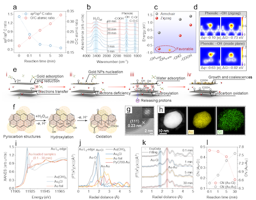 图3、图4分别为热解碳吸附剂回收黄金机理的表征和理论计算结果。热解碳表面的芳香结构提供了关键的电子源,通过水中羟基化过程同时生成电子和酚羟基,用于还原金离子。XPS和FTIR分析显示,金吸附过程中,热解碳的石墨化碳结构发生氧化,石墨化结构中的sp2-杂化碳转变为sp3-杂化碳。实验和理论计算揭示了水分子在热解碳表面解离为羟基离子和质子,羟基离子诱导芳香结构羟基化,生成更多的酚羟基并提供电子用于高价金的还原。DFT计算表明,氯络合态的金离子通过逐步脱氯反应形成金-氯中间体,这一团簇状中间体随后逐步还原生成金核,降低了整个还原过程的反应能垒。