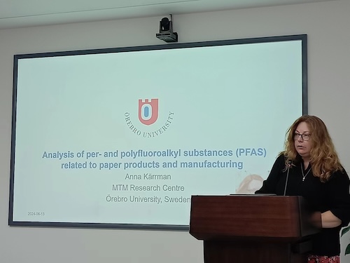 Anna Kärrman作题为“Analysis of per- and polyfluoroalkyl substances (PFAS) related to paper products and manufacturing”的专题报告。报告提示食品包装等纸制品中的PFAS可能是人体暴露或末端排放的重要来源,且造纸工业中PFAS的长期使用已被证实会导致环境排放问题。报告主要介绍了两项针对瑞典造纸工业区纸制品及附近沉积物的研究,并概述了PFAS分析方法所面临的难点和挑战。由于当前环境中潜在的PFAS数量众多且缺乏分析标准,有必要运用有机氟分析和氧化预处理等方法进行非特异性评估,并整体评估有机氟的暴露风险。