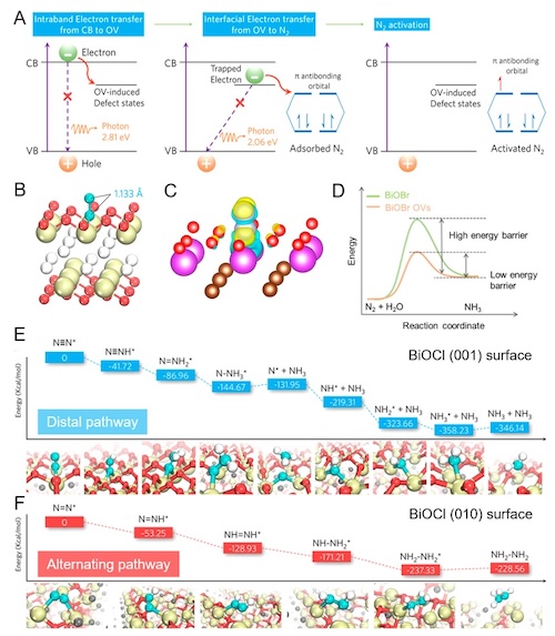 受生物固氮酶中Fe蛋白(电子泵)和MoFe因子(N2结合和活化中心)协同作用的启发,设计合成兼具电子供体和催化活性中心的半导体材料能够以较少的能耗来最大化提高光催化N2还原合成氨效率。为验证这一设想,我们在可见光响应的半导体材料溴氧化铋(BiOBr)表面引入了阴离子缺陷---氧空位。氧空位主要通过三个途径提高BiOBr光化学N2还原合成氨效率:(i)加速亚能带间接激发、拓宽可见光吸收范围并减小带隙;(ii)抑制电中性激子产生及电子-空穴对本体复合;(iii)含有大量局域电子的配位不饱和中心可以作为N2分子的吸附和活化中心。理论计算结果表明,N2在BiOBr-(001)表面氧空位处以不对称端位加氢模式进行(N2 → *N-NH3 → *N + NH3 → 2NH3),而BiOBr-(010)表面氧空位处以交替加氢方式进行(N2 → *N-NH → *NH-NH3 → N2H4)。这些机制差异加深了我们从分子层面理解光催化N2还原合成氨机制并有助于指导合成高效合成氨光催化剂(J. Am. Chem. Soc., 2015, 137, 6393-6399;Acc. Chem. Res., 2017, 50, 112-121;Nanoscale, 2016, 8, 1986-1993;Appl. Catal. B-Environ., 2022, 301, 120766)。