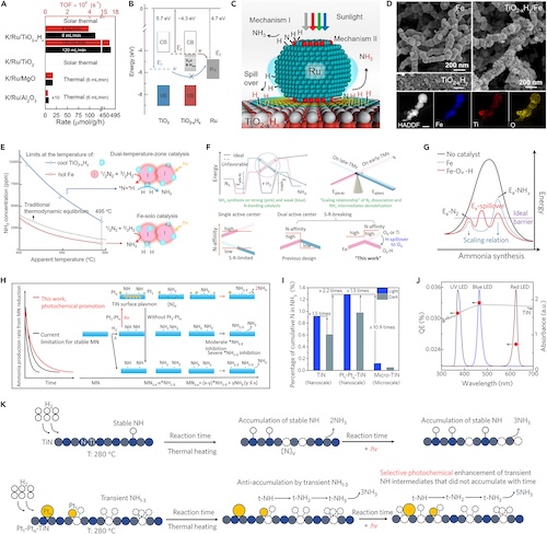 与光催化反应相比,光热催化反应能够利用零带隙的纳米金属而非仅紫外光响应的半导体材料为催化剂,极大提高了全太阳光谱的能量利用效率。此外,光热催化固氮主要通过N2和H2的气相反应合成氨,不依赖于水相体系中H2O与N2的反应。这些差异赋予了光热催化剂能够通过等离激元(LSPR)效应利用全太阳光谱(300-2500 nm)合成氨,以及借助载流子和辐射热来高效解离N2和H2分子。鉴此,团队发展了K/Ru/TiO2-xHx光热催化剂,在低温(360 C)常压下合成氨速率可媲美传统哈伯工艺(Appl. Catal. B-Environ., 2018,224, 612-620);发展了具有“双温区”的Fe纳米项链负载氢化TiO2-xHy光热催化剂,发现Fe纳米项链(热区)与氢化TiO2-xHy(冷区)之间的温度差能够加速N2分子在“热区”解离并在“冷区”形成NH3(Chem, 2019, 5, 2702-2717);进一步研究表明,Fe纳米项链负载氢化TiO2-xHy光热催化剂打破了N2解离过程中N2分子吸附-反应活化能垒与NHz物种从催化剂表面脱附之间的制约关系(J. Am. Chem. Soc., 2020, 142, 17403-17412);构建了具有光化学与光热化学双重特性的Pt1-Ptn-TiN光热合成氨催化剂,发现光化学反应能够选择性促进TiN表面还原加氢至Ti-NH,而Pt1-Ptn可以促进Ti-NH继续加氢至游离氨(J. Am. Chem. Soc., 2023, 145, 13134-13146)。