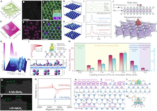 与光化学合成氨过程类似,室温条件下可能再生能源驱动的电化学N2还原合成氨有望替代高能耗的哈伯工艺。然而,水溶液中电化学N2还原合成氨效率受极难活化的NN键影响而面临法拉第效率低、竞争性析氢反应严重、NH3产率不高及产物难定量等问题。团队提出了利用界面极化电场诱导NN键解离策略,即在MoS2原子层表面负载凸起状Fe单原子催化剂,发现位于Mo原子上方的Fe单原子通过Fe-S键与周围三个S原子配位,其诱导产生的极化电场强度(17.92 eV)超过了N2离子势(15.84 eV),实现了N2分子NN键直接断裂并显著提升了合成氨速率和法拉第效率(Chem, 2020, 6, 885-901);尽管MoS2电催化剂中引入S空位能够促进自旋极化电子的产生并实现N2至NH3的转化,但局域在S空位处自旋极化电子的快速消耗会妨碍NN键活化。团队研究发现MoS2原子层边缘处暴露的大量Mo位点能够促进自旋离域电子产生,进而形成自旋离域电子库,诱导电子快速填充至N2分子的反键轨道并断裂NN键(Appl. Catal. B-Environ., 2023, 323, 122186)。