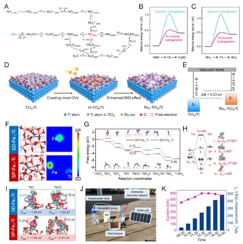 硝酸根是继N2和有机氮以外地球上第三大“氮汇”,其过量排放会破坏全球氮循环、污染地表水、影响水生生态系统并对人类健康造成严重威胁。中国河水中平均硝酸根浓度约15.35 mg/L,具有自西向东、自北向南的不均匀分布特征。尽管废水或地下水中硝酸根的通用处理策略是将其转化为无毒的环境分子N2,但该过程不能实现其升级回收产生高附加值氨或铵盐。从资源和能量回收角度而言,电催化硝酸根还原过程中硝酸根脱氧所需的能量远小于NN键裂解能,有望成为更有前景的绿氨合成工艺。从水溶液中硝酸根还原路径来分析,硝酸根吸附是反应决速步,但中间产物*NO的加氢方式则决定了产物的最终分布。团队提出利用原子氢(H*)降低*NO和*NH2加氢过程中过渡态能量的策略来促进硝酸根还原制氨(HNO H2NO、NH2 NH3);然而,用于硝酸根还原的H*来源于水分子裂解,但较大的HO-H键断裂能会影响了电催化剂的H*供应能力(J. Am. Chem. Soc., 2020, 142, 7036-7046);利用表面氟化策略来处理Cu电极,发现表面修饰的F与吸附H2O分子间形成了界面O-HꞏꞏꞏF键,可以显著降低水解离能垒(Environ. Sci. Technol. 2024, 58, 7208-7216);考虑到粉末电催化剂使用过程通常需要利用聚合物粘合剂来锚定在导电载体上,这不仅增加了材料合成过程的复杂性、降低了材料导电性,还容易导致电催化剂与载体间接触不紧密。鉴此,团队利用无支撑的泡沫钛基单原子整体电极来增强反应活性位点与载体之间的化学作用,发现泡沫钛表面的无定型氧化层能够牢固稳定负载的金属单原子(Angew. Chem. Int. Ed., 2022, 61, e20220821);构筑的自旋极化Fe1-Ti双位点能够将吸热的*NO-*NHO加氢过程转化为自发放热过程并降低*NH2-NH3转化过程能垒(Nat. Commun. 2024, 15, 88);考虑到目前的氨分离和回收装置在不同应用场景面临高能耗、投加化学试剂、精准pH调节及外加热等问题,利用可再生能源驱动的透过式耦合装置实现了电化学还原硝酸根到氨及氨原位回收(Water Res.,2023, 242, 120256-120256)。