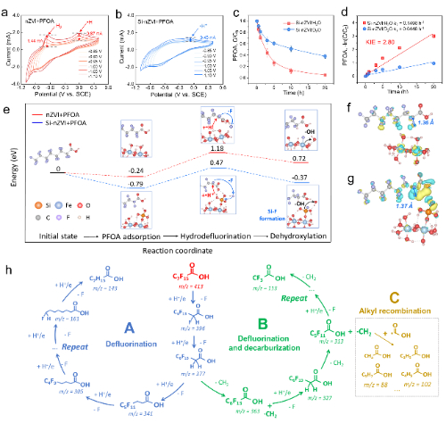 该团队通过氢物种动力学过程研究PFOA的加氢脱氟过程。电化学CV曲线结果显示,在PFOA存在时,Si-nZVI表面•H*的氧化峰显著减弱,且仍然没有H2的氧化峰,说明Si-nZVI在加氢脱氟反应中消耗了•H*。氢同位素效应实验显示,氢转移过程时PFOA去除的决速步。该团队利用DFT理论计算探究了PFOA在Si-nZVI表面的分子作用机制,计算结果显示Si-nZVI加氢脱氟反应的能垒为+0.47 eV,远低于nZVI的反应能垒(+1.18 eV)。而Si位点对F的固定存在去羟基化过程,形成Si-F键的同时释放了0.84 eV从而补偿了C-F键断裂所需能量。该团队利用液相色谱-质谱联用仪(LC-MS)对PFOA的降解中间进行监测,发现PFOA在•H*的亲核进攻下,在α-C位置发生连续加氢脱氟反应;随后脱氟后生成的-CH2-基团因其电荷密度不稳定脱去;该脱碳过程中生成的自由基(•COOH、•CH2、•CnH2n+1)会相互重组,生成各种烷基羧酸等环境友好的产物。