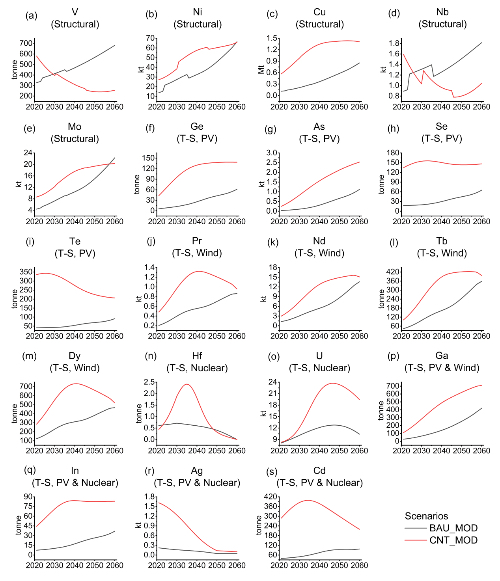 图2 基准情景及碳中和情景下2021-2060年间的19种关键资源的年度需求