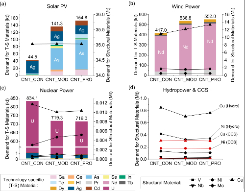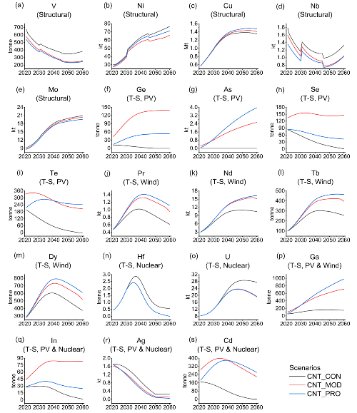 就年度需求而言,镨(Pr)、钕(Nd)、铽(Tb)、镝(Dy)、镓(Ga)等被风力发电需求的技术性资源在激进技术市场份额情景下基本一直高于其他市场份额情景。除银(Ag)以外的所有被光伏发电需求的技术性资源在较新和激进市场份额情景下的年度需求也持续显著高于保守情景。如锗(Ge)、砷(As)、碲(Te)等被光伏发电需求的技术性资源年度需求随市场份额变化最为显著。钒(V)、镍(Ni)、铌(Nb)三种结构性资源的年度需求受风力发电或水力发电资源需求的影响也有明显变化。