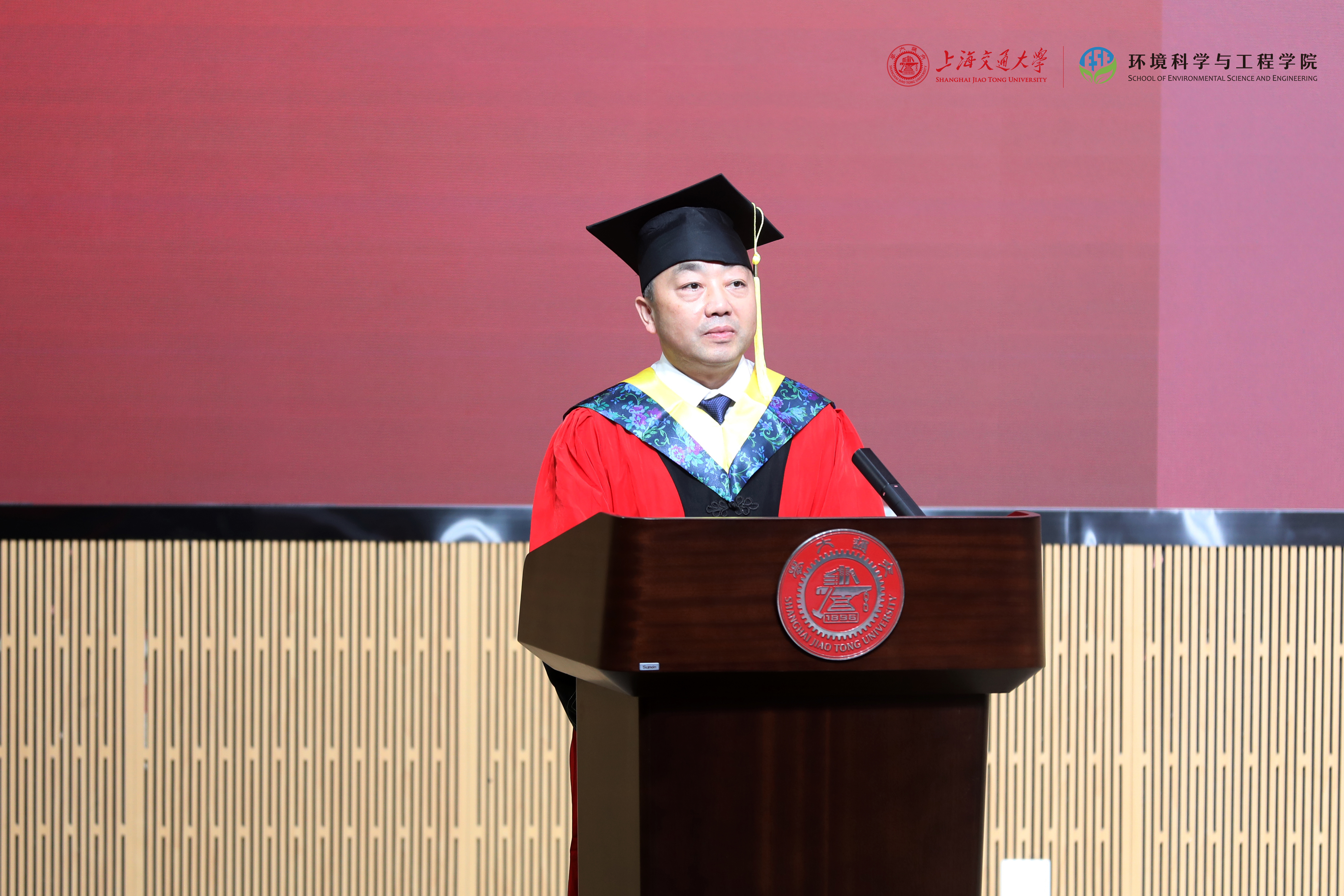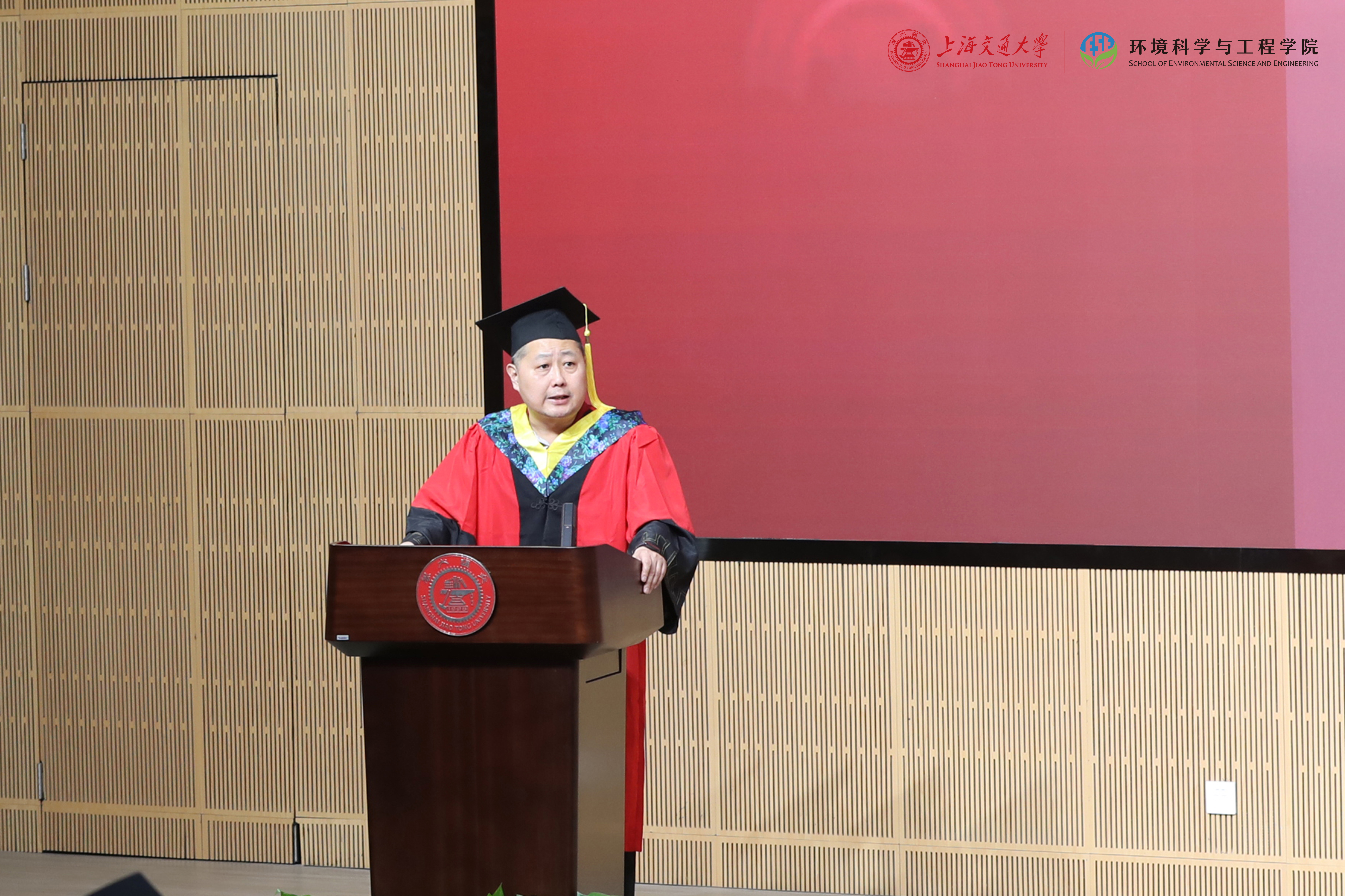 曾小勤代表学校向学院132位2025届毕业生致以热烈祝贺。他指出,站在社会发展转型的十字路口,环境问题已经升维为人类文明的战略命题。他希望毕业生们不仅要敢于攻克技术瓶颈,更要在哲学层面反思发展范式,始终追求三种素质:恪守科学家的求真精神、锤炼工程师的务实品格、涵养人文者的济世情怀。他勉励毕业生们永葆“饮水思源”的初心,牢记“美丽中国”的使命,怀揣“志在凌云”的抱负,书写交大环境人的青春华章。