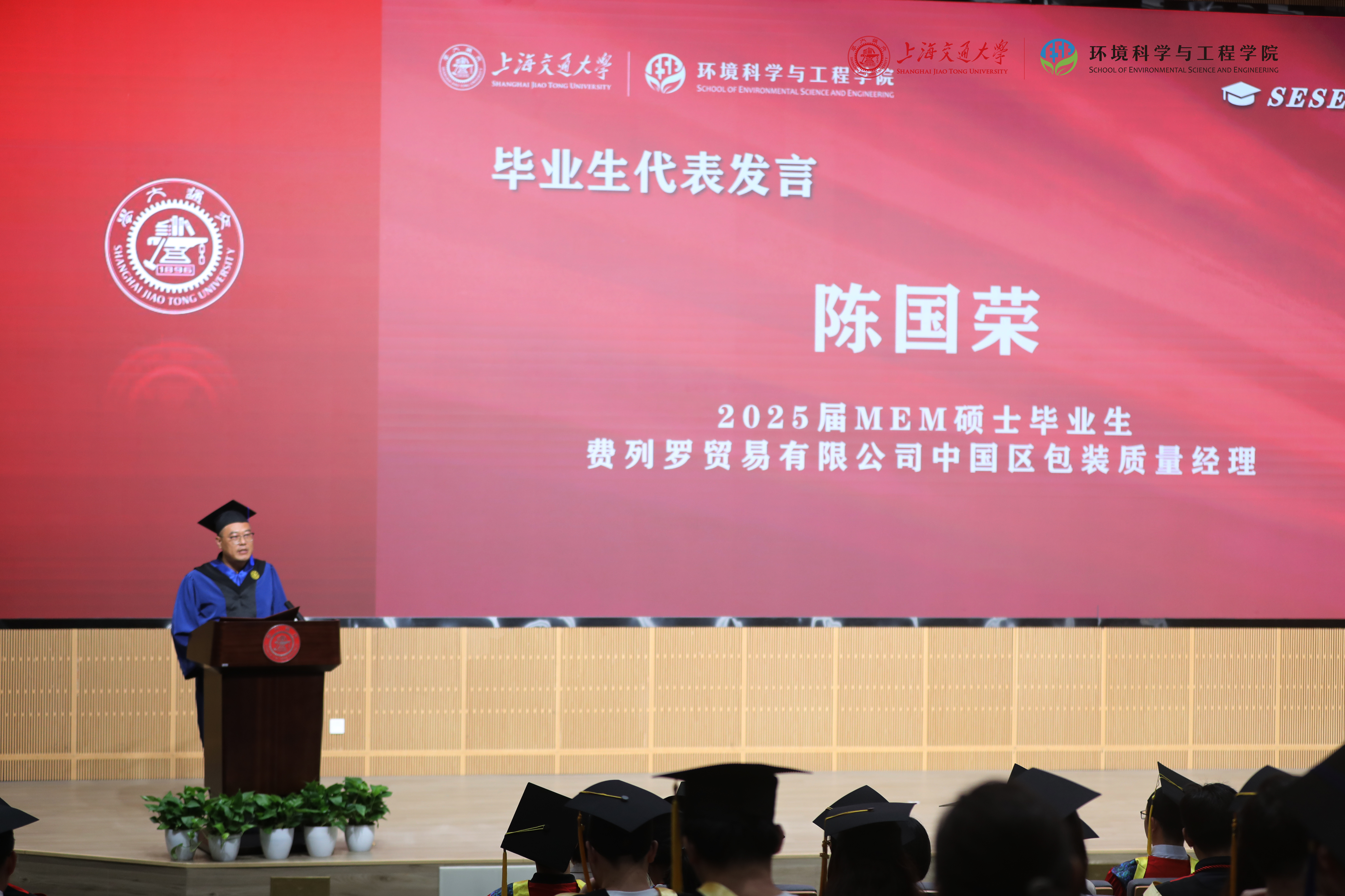 学院2025届工程管理硕士(MEM)毕业生代表陈国荣在发言中,用“初心如磐,砥砺前行,破茧成蝶”总结回顾了自己在交大学习的点滴。他表示,这段求学经历让他收获了人生宝贵的财富,他将带着学校赋予的坚定信念奔赴下一段旅程。