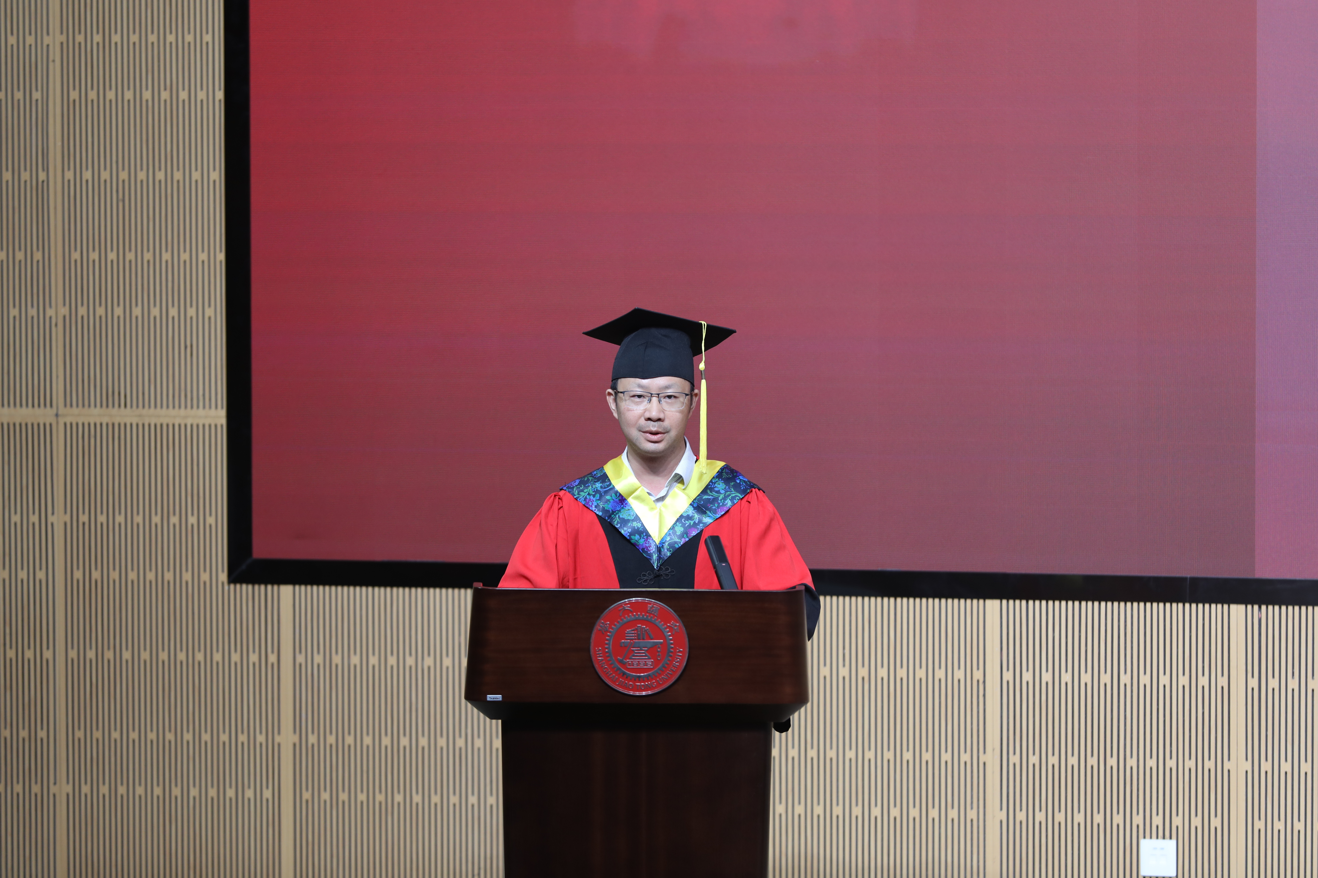 学院2025届博士毕业生王海飞以“未来,我们一帆风顺”为主题发言。他分享了自己求学与科研的经历,在学院和老师的关心、支持与指导下,他在一次次失败中收获在留白处开疆拓土、在混沌中开辟道路的勇气和能力。他深情感谢学校、学院、师长的培养,并祝愿全体毕业生梦想常青,担当常在。
