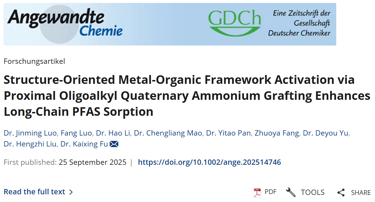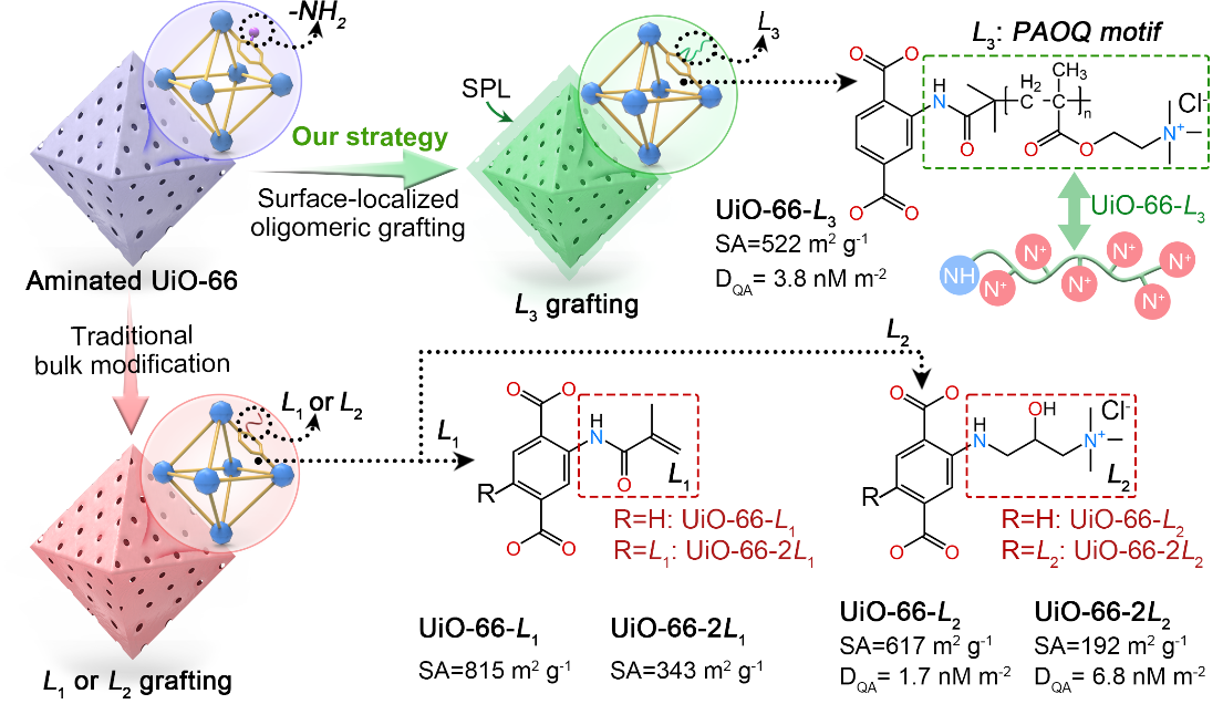 近日,日本女优 罗金明副研究员在《德国应用化学》(Angewandte Chemie)上发表了题为“Structure-Oriented Metal-Organic Framework Activation via Proximal Oligoalkyl Quaternary Ammonium Grafting Enhances Long-Chain PFAS Sorption”的研究成果。该研究成果突破传统MOF修饰局限,提出了一种表面局域化寡聚枝接策略,在UiO-66-NH₂表面精准构筑了邻近排列的寡聚烷基季铵盐(PAOQ)功能基元。该设计巧妙规避了MOF内部微孔的空间限制与传质壁垒,实现了功能基团负载量2.2倍的提升,并通过季铵盐与柔性烷基链的精确空间协同,实现了对长链PFAS的双模式高效捕获。