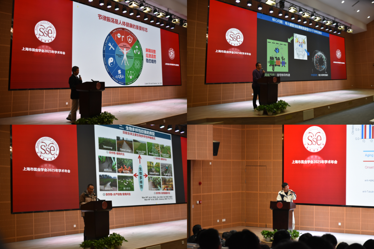 大会主旨报告由中国科学院植物分子卓越创新中心詹帅研究员主持。苏州大学张勇教授、中国科学院植物分子卓越创新中心蒋兴聪研究员、华东理工大学万年峰教授、复旦大学杨烁研究员围绕生物节律、种群动态、生物多样性控害、昆虫病毒传播等前沿领域依次作报告。