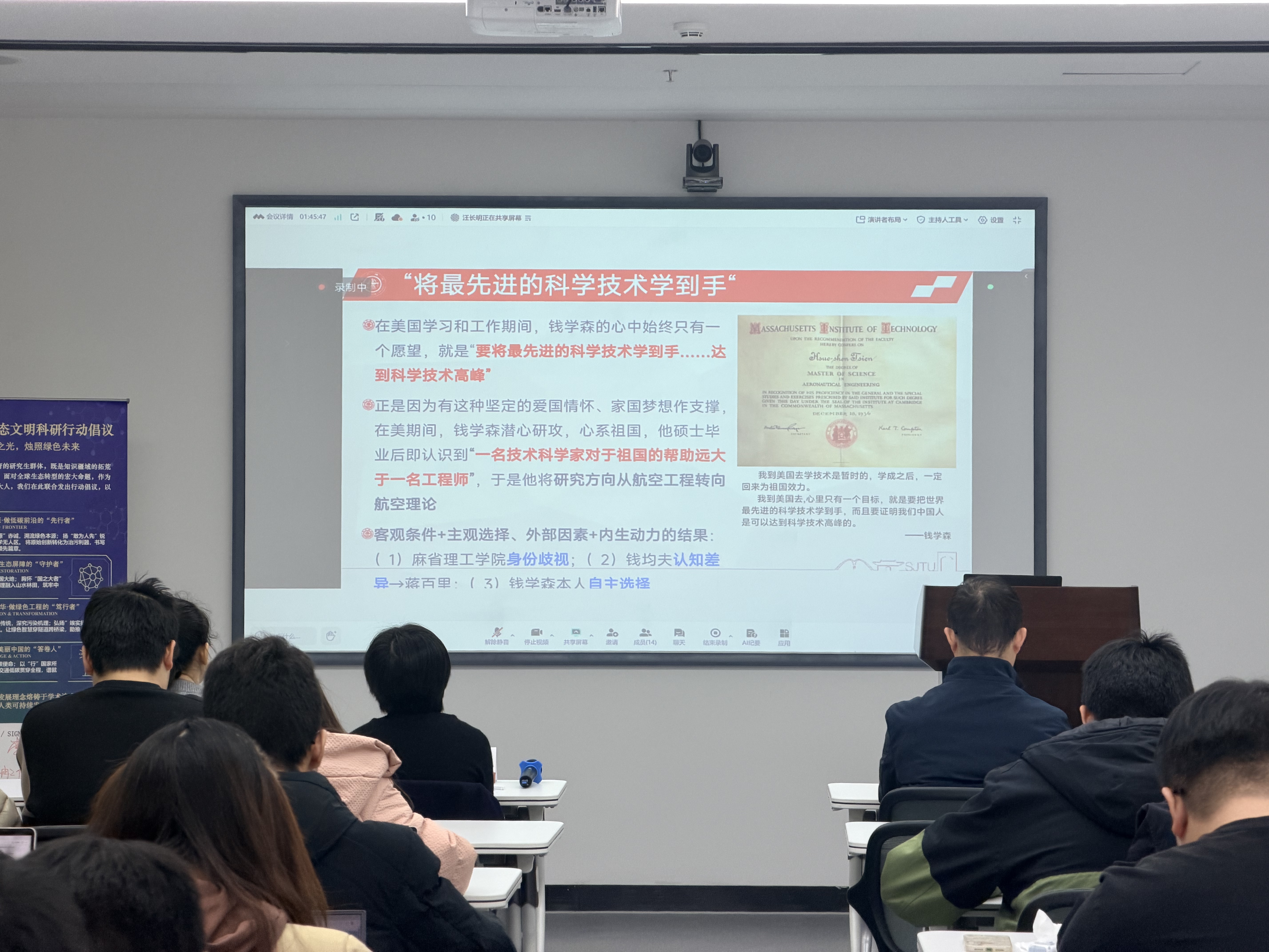 汪长明以世界反法西斯战争胜利80周年与钱学森归国70周年为背景,作《科学与和平——钱学森对世界反法西斯战争的贡献》专题报告。报告中,汪长明老师以开阔的历史视角,系统梳理了钱学森波澜壮阔的人生轨迹与彪炳史册的科学贡献,深入阐释了其“理论联系实际”的治学方法与思想精髓。最后,他从钱学森早年的报国志向谈到其晚年对后继人才的殷切期盼,并勉励与会环境学子传承科学家的爱国情怀与求真精神,将个人所学融入国家生态文明建设的伟大实践中。