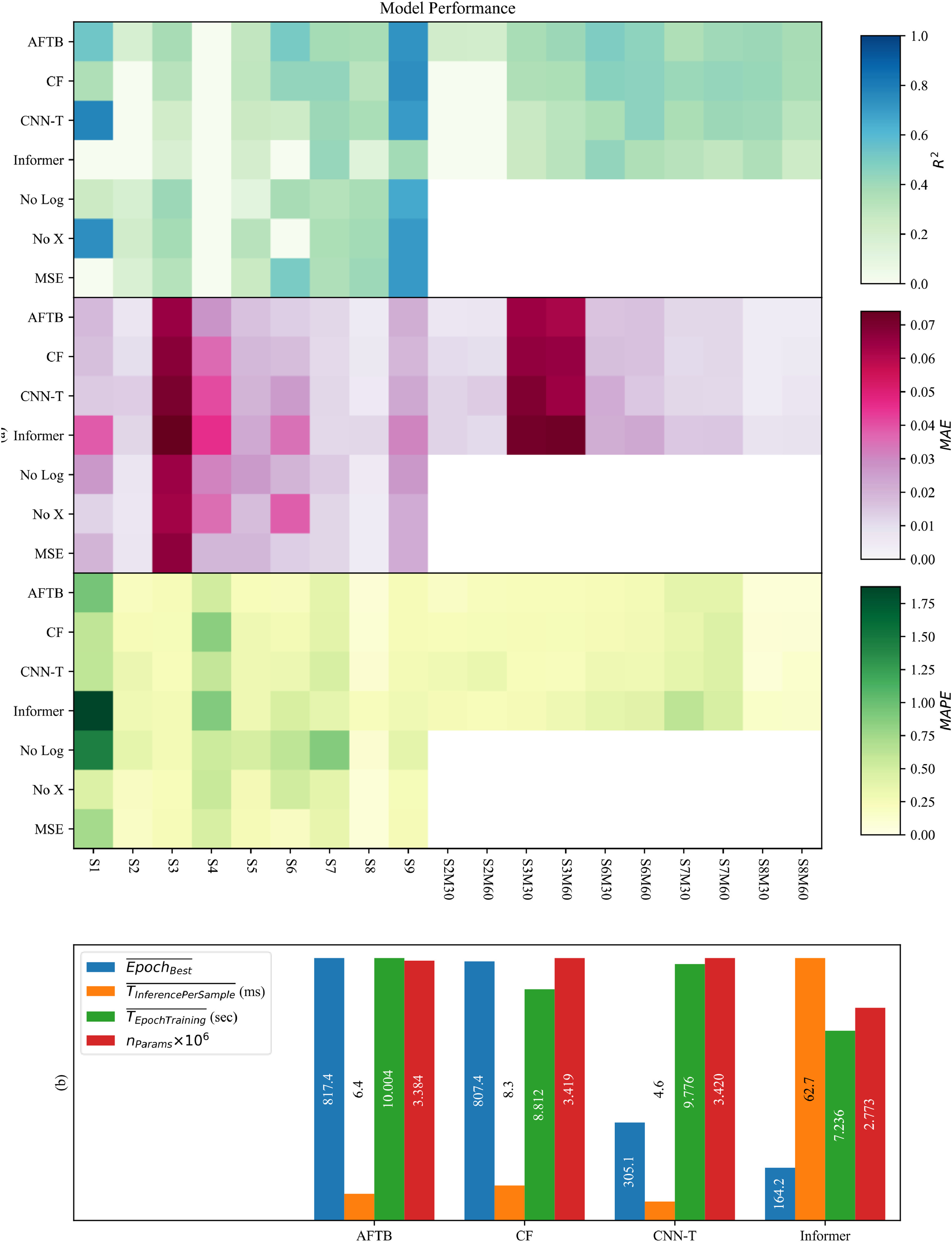 各神经网络模型及训练策略的性能通过R2、平均绝对误差MAE和修正平均绝对百分比误差MAPE在9个浮标及12个预测步长(1–12步;“All”表示所有步长的汇总结果)上进行评估。结果分别采用9个浮标的算术平均值与合并均值进行汇总。为评估低数据完整性下的鲁棒性,本研究对5个本征缺失率较低的浮标(S2、S3、S6–S8)开展了完全随机缺失实验(MCAR)。针对每个浮标,将训练集随机减少30%(M30)或60%(M60)。四种算法(AFTB、CF、CNN-T、Informer)均在这些缩减后的训练集上训练,验证集与测试集保持不变。每个浮标在每个MCAR水平下仅生成一个数据副本。本研究所提出的AFTB与以下变体进行了对比: