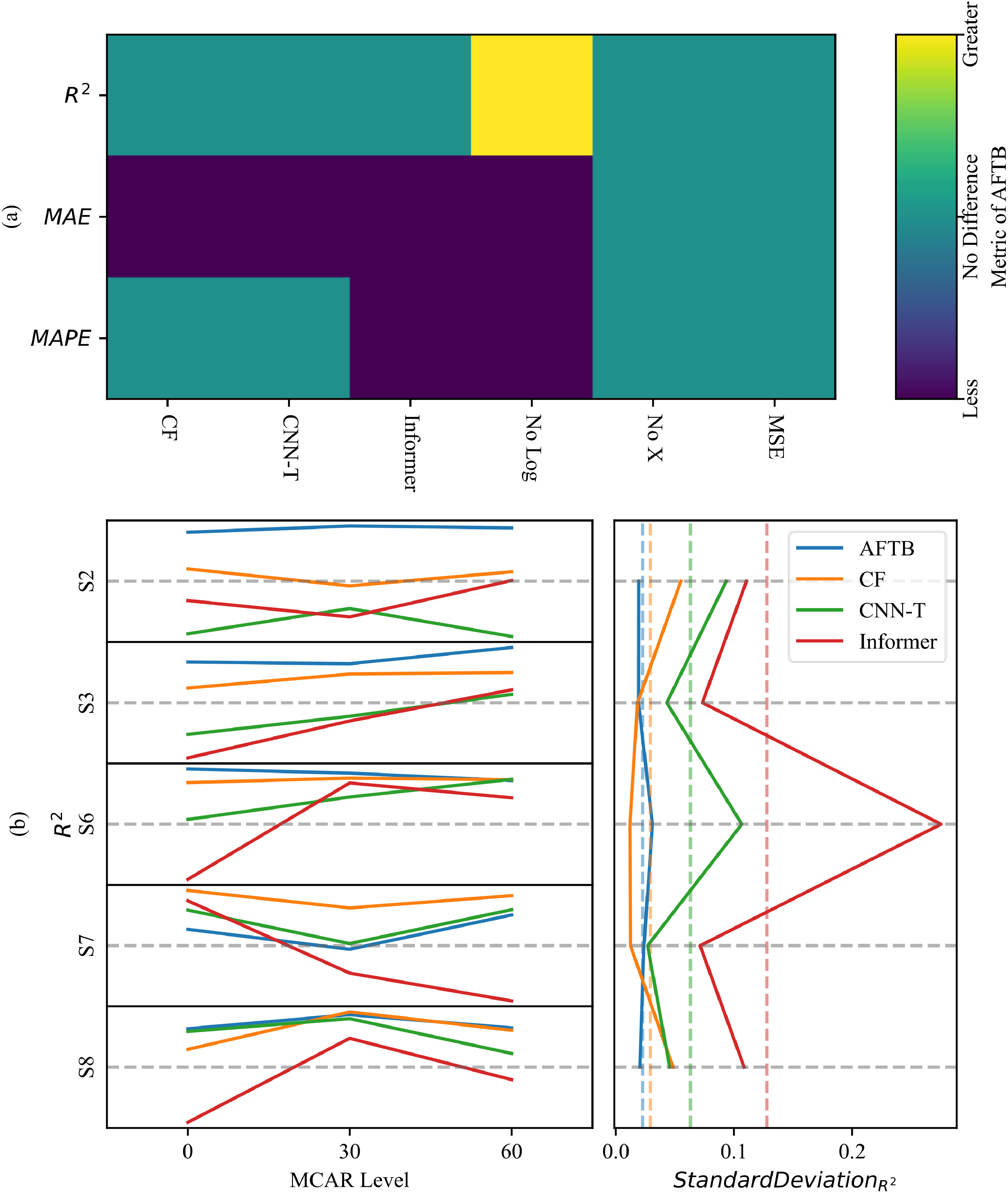 结果表明,AFTB具有预测准确性优势,并在MCAR实验中以最小的标准差均值证明了自身对抗数据缺失的稳健性。