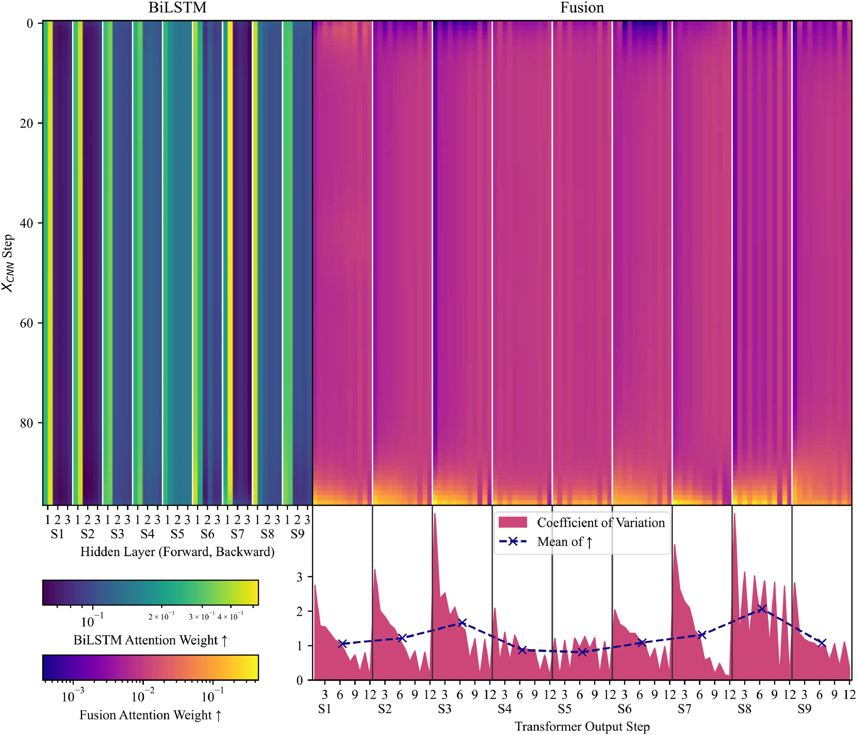 AFTB模型包含两个核心注意力模块:一个用于对BiLSTM的隐藏状态进行加权(BiLSTM注意力),另一个用于融合BiLSTM与Transformer分支的输出(融合注意力)。在BiLSTM注意力中,第一层BiLSTM的隐藏状态始终获得最高权重;在融合注意力中,BiLSTM 序列的末尾步长对首个预测步长最为关键,后续预测步长的关注点逐渐分散,转为长程依赖。