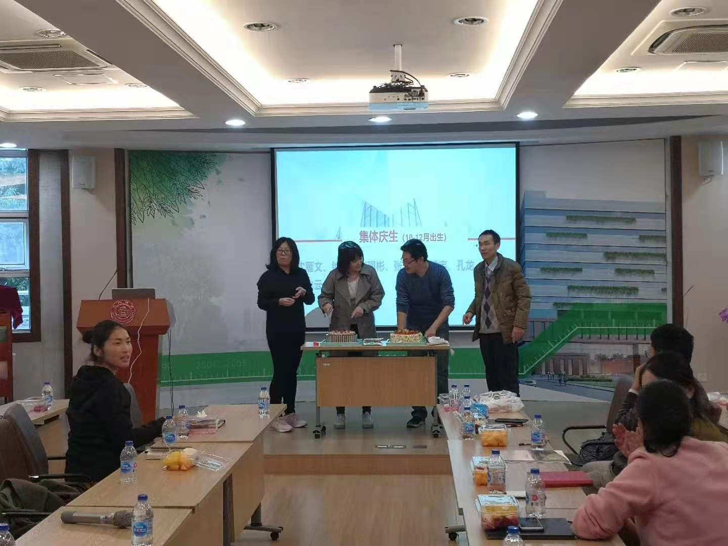 会上学院党政办、科技发展办及学生培养办负责人,分别介绍了科室人员调整和岗位职责情况。全体与会人员还为10-12月生日的老师集体庆生。