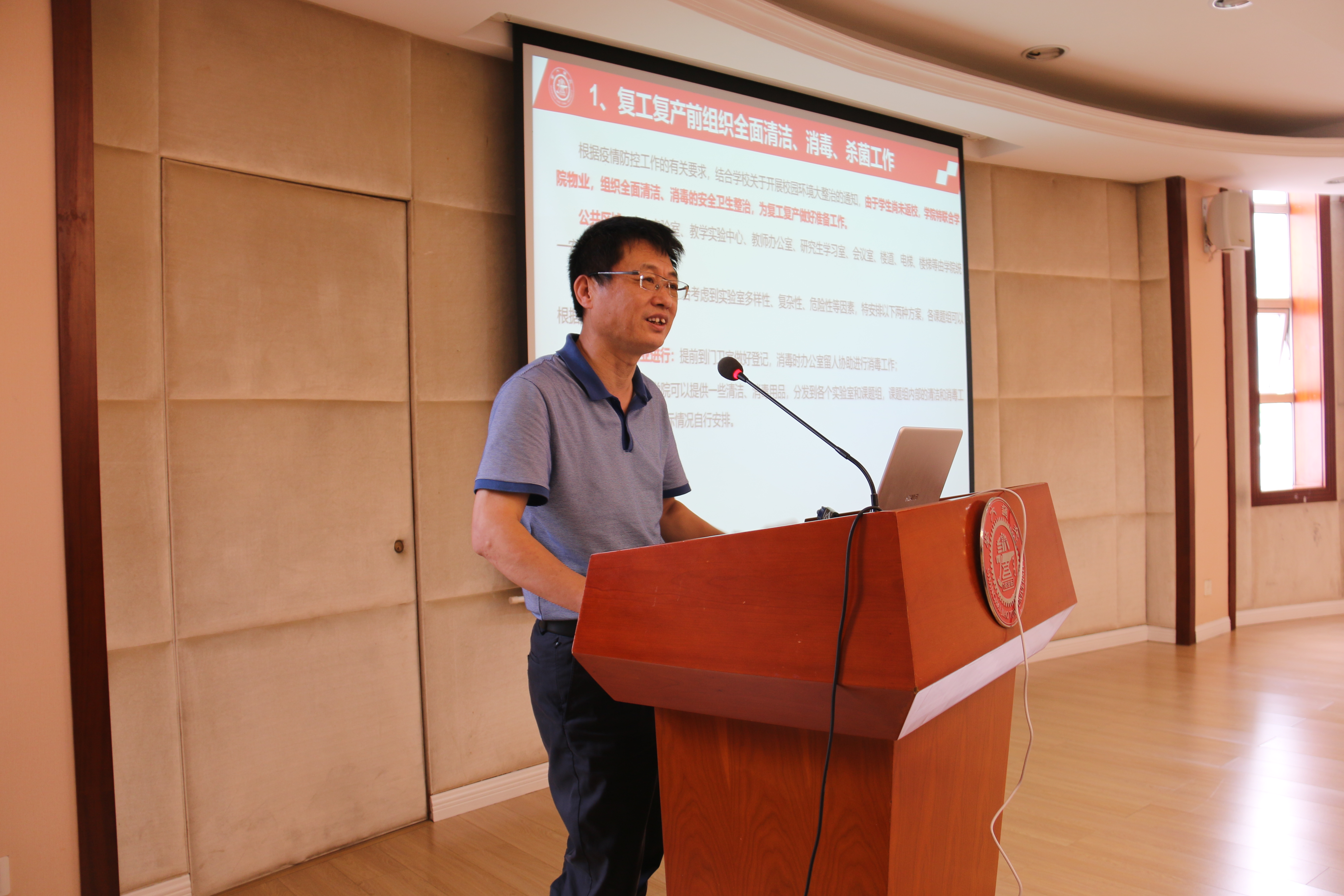 副院长许振明作2020年春夏学期安全、测试中心、资产、产学研情况及下半年工作计划。许振明指出,本学期由于新冠疫情影响,学院大力加强了复工复产前各区域的全面清洁、消毒、杀菌工作,并进一步规范了学院安全及卫生工作,组织开展了第二届环境卫生评比大赛并成立学院安全卫生督导小组。
