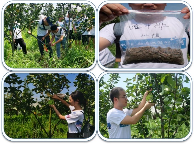 实践团队首先来到众熠梨园,对马路村科技兴农项目进行了参观学习。时值盛夏八月,炎炎烈日下的梨园更显绿意,在负责人带领下参观并品尝了翠玉蜜梨,枝繁叶茂的梨园和清香脆甜的果实展现了科学种植和生长环境的重要性。参观中,同学们了解了梨树种植技巧,结合专业优势,对栽培梨树的土壤进行分批采样,并将样品带回学校进行研究和分析。同时,支部成员还积极认领梨树,以专业优势助力梨园发展,用科学方法对梨树生长环境建立周期性监测。