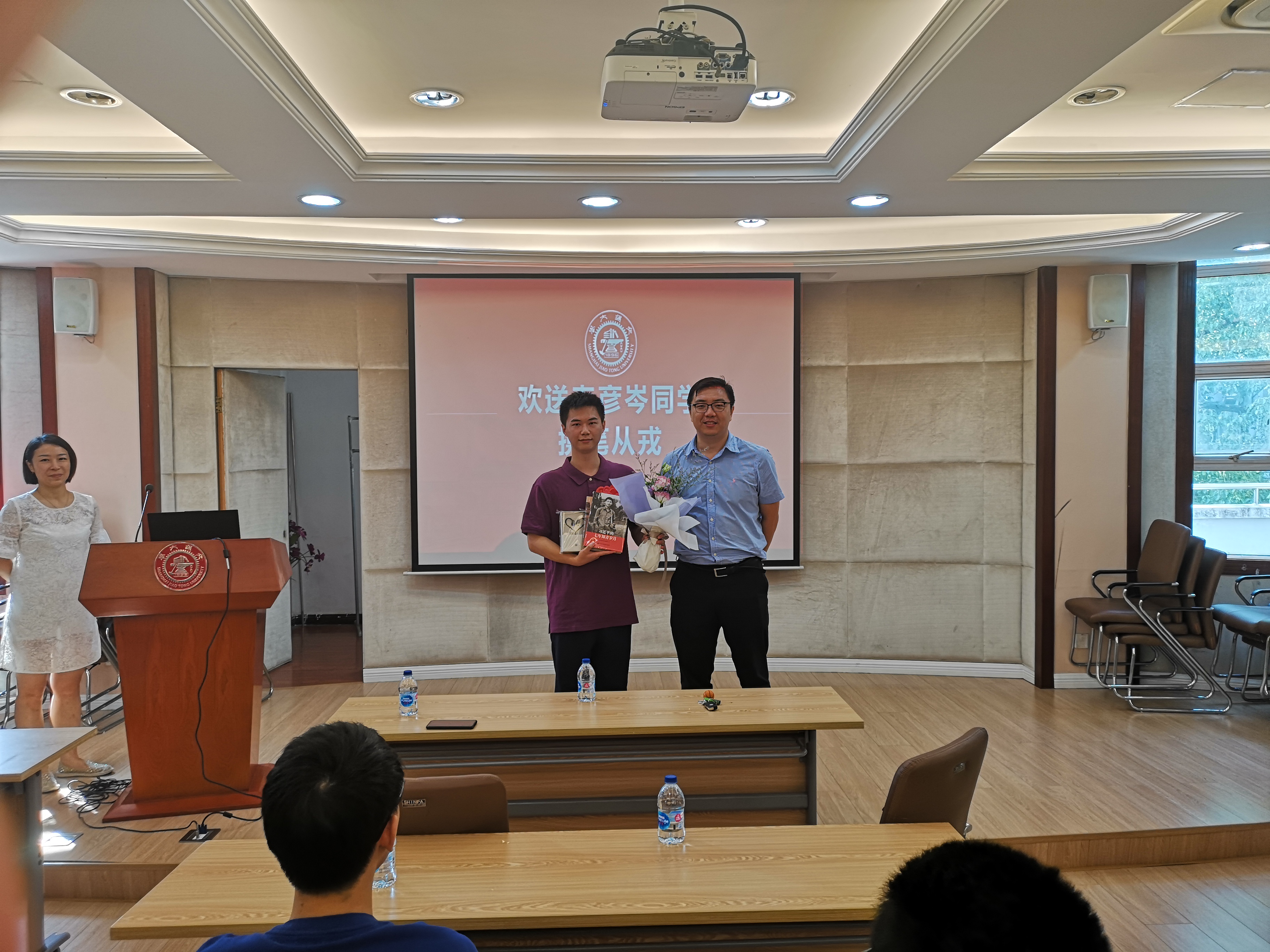 党委副书记陈哲老师发言,祝福之余,也提出了对于战士的期望:时刻记得自己交大人的身份,做好一名普通战士的同时,也要发扬交大人的优良作风,把敢于承担,争当先进的品质带入军营。陈哲老师还送上了学院精心准备的学习读物,希望韦彦岑在军营中也不忘学习提高自己,做有思想、有担当、有追求的好战士。