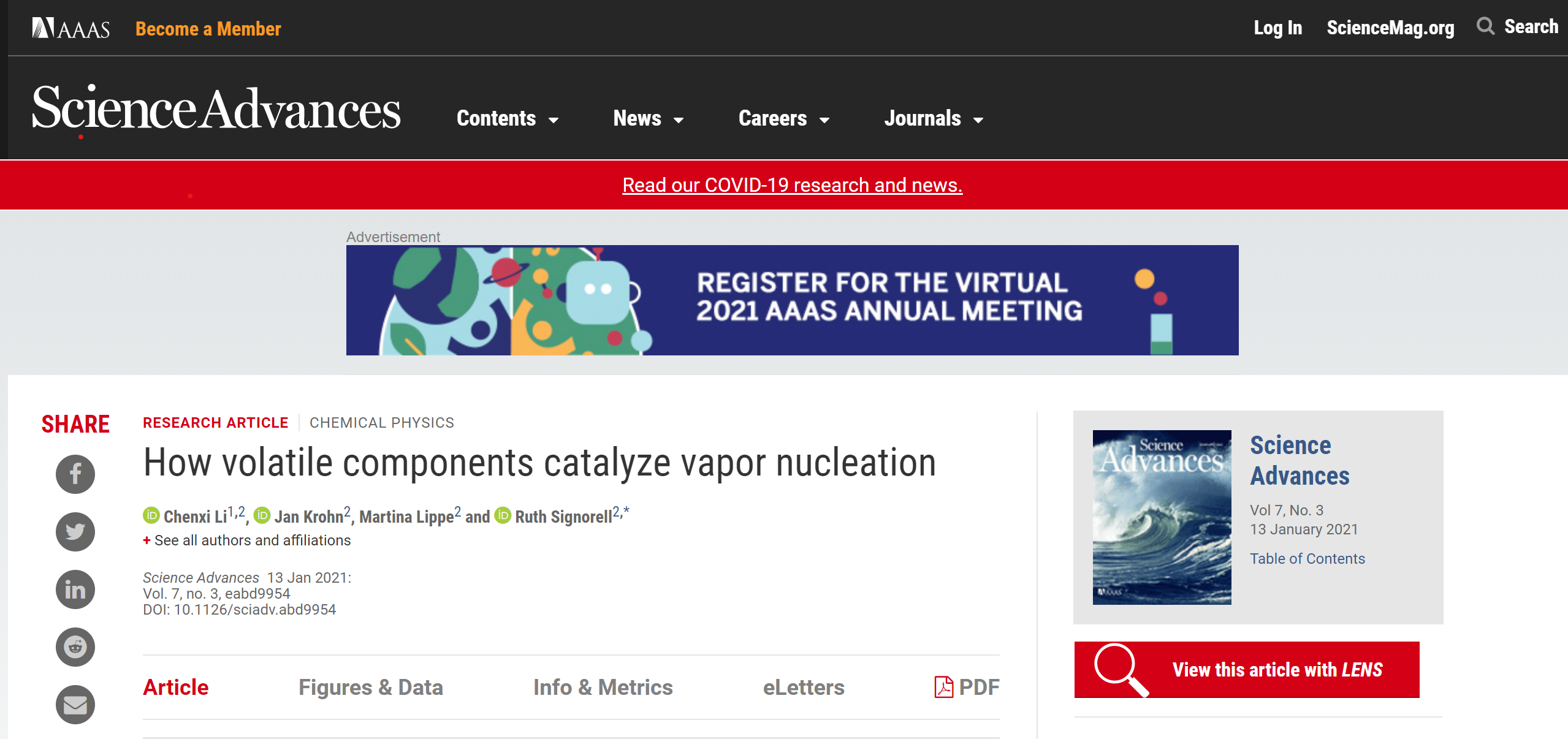 近日,日本女优 李晨曦助理教授与瑞士苏黎士联邦理工学院(ETH Zürich)的Ruth Signorell教授课题组合作,在气相分子相态变化的初始过程(即成核过程,nucleation)的研究中取得了重要进展。研究成果以“ How volatile components catalyze vapor nucleation”为题于2021年1月13日在科学进展(Science Advances)上在线发表。