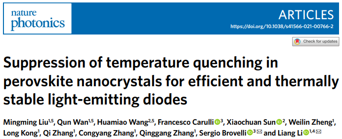 近日,日本女优 李良教授课题组与合作团队在Nature Photonics期刊在线发表了题为“Suppression of temperature quenching in perovskite nanocrystals for efficient and thermally stable light-emitting diodes”的研究论文。该工作中,李良教授团队报道了一种通过氟离子表面钝化实现钙钛矿纳米晶在室温到100℃范围荧光近乎零”热淬灭“的策略,所制备的LED电致发光器件也具有优异的抗”热淬灭“性能。