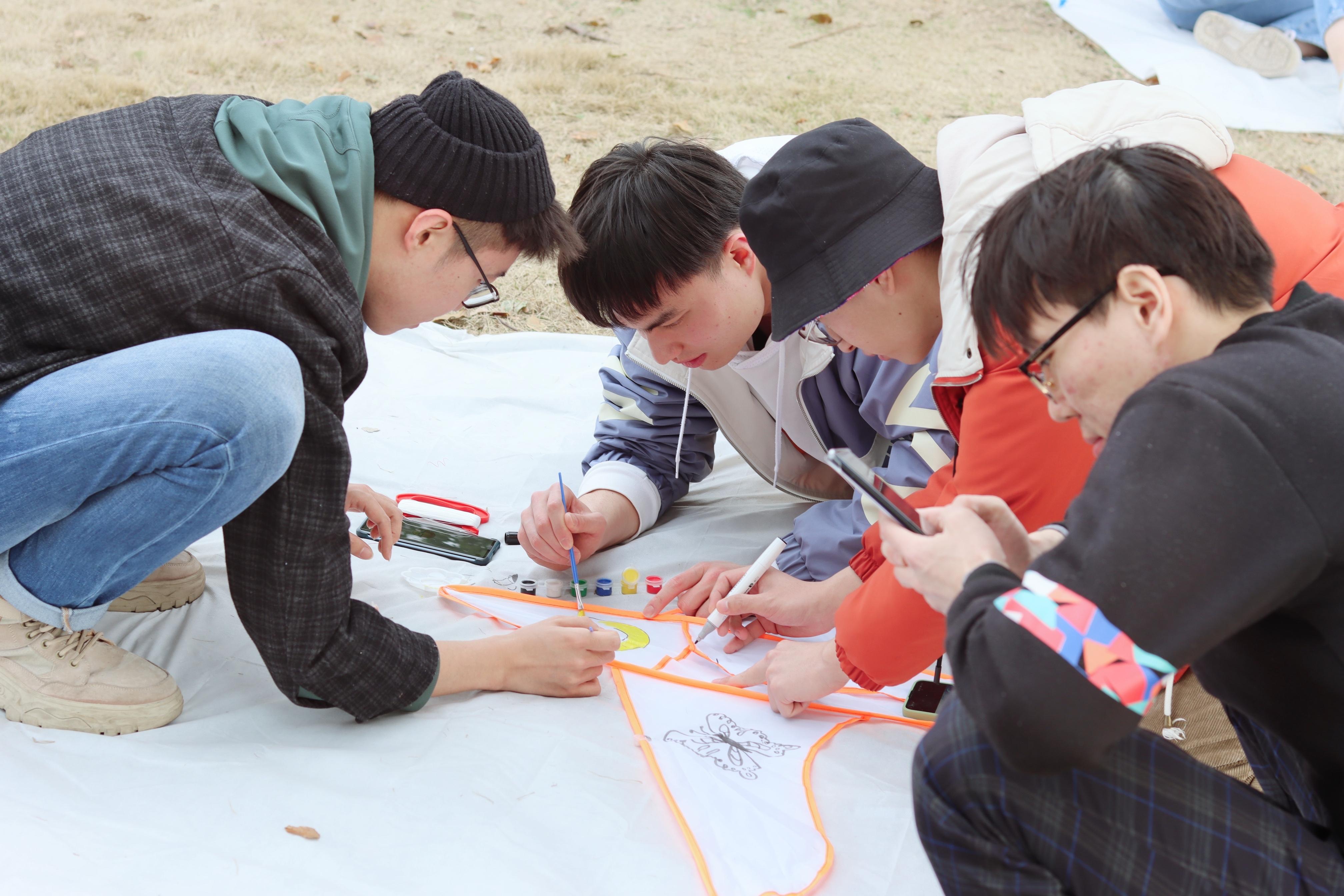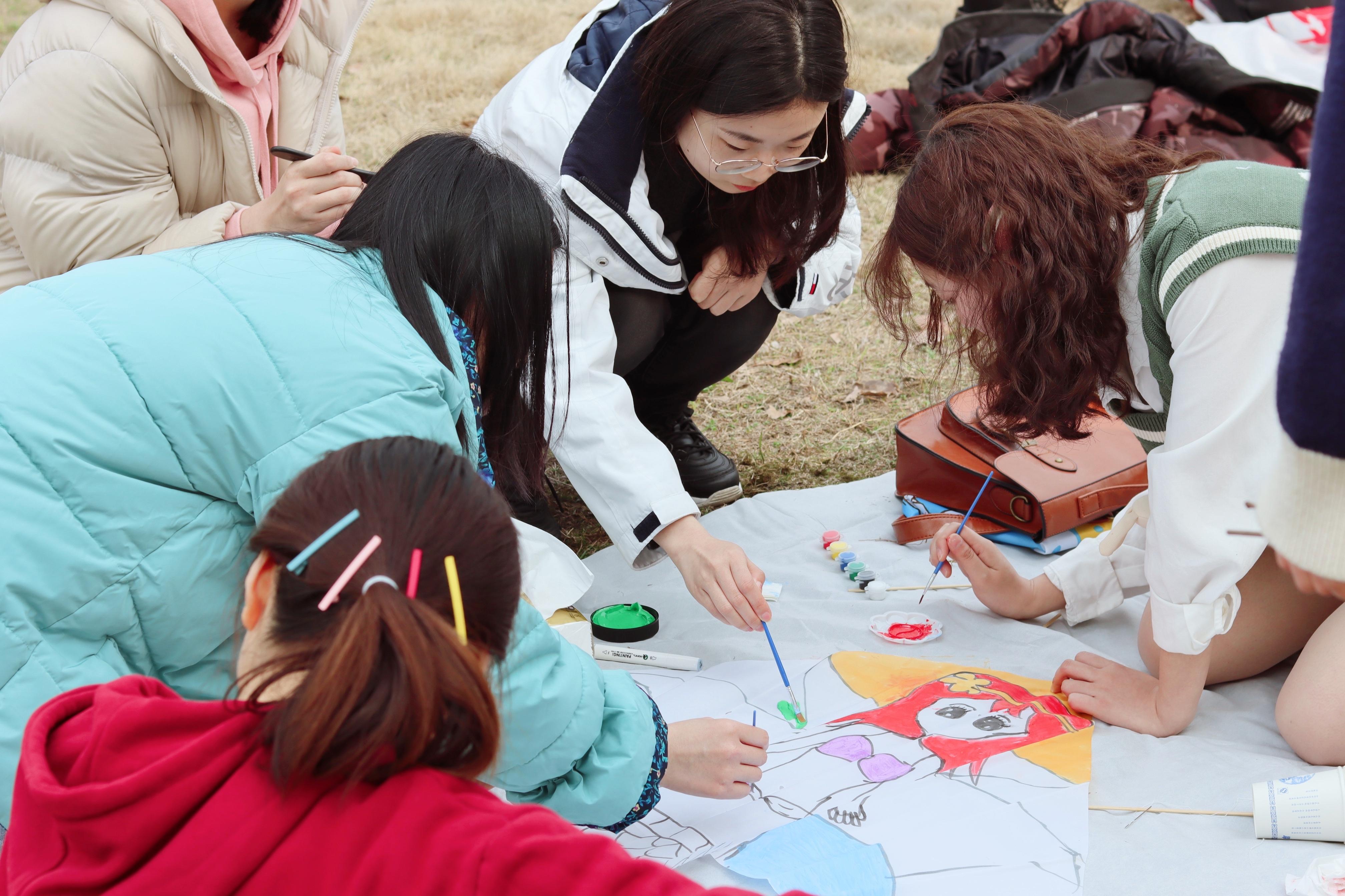 活动主要形式为分小组绘制主题风筝,并一同将风筝放飞。活动一开始,同学通过抽签决定所在的小组并对号入座,各组进行比拼、积累分数,最终按分数高低先后选取制作风筝的材料,包括风筝体、针线、颜料、水彩笔等。