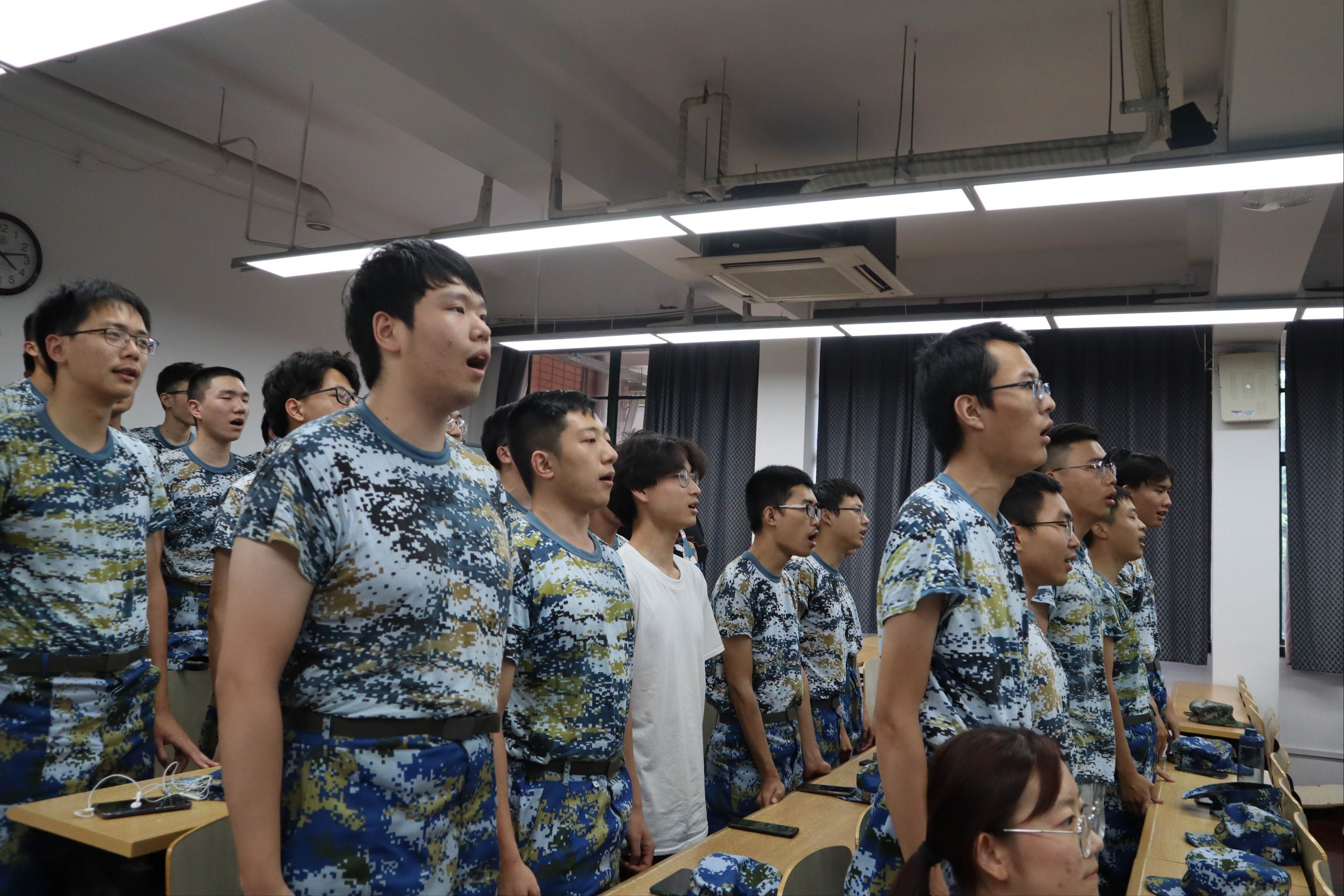 26连指挥员兼连长于爱涛老师向领导们汇报了学院男生连24连和女生连26连取得的优秀成绩。到目前,24连获得两次优秀标兵连和两次营部嘉奖,26连得到一次“沙场争锋”旗、两次营部嘉奖。之后,参训学生展示了《芳华纪念册》、《采访小记:从零开始的军训生活》及参训照片,同学们认真训练,意气风发。26连的女生们歌唱了精心改编的歌曲《欧若拉--军训版》,24连的男生们用洪亮的声音歌唱了《强军战歌》,环院学生们的歌声展现出学子们自强不息的精神风貌,得到了院领导的认可与肯定。