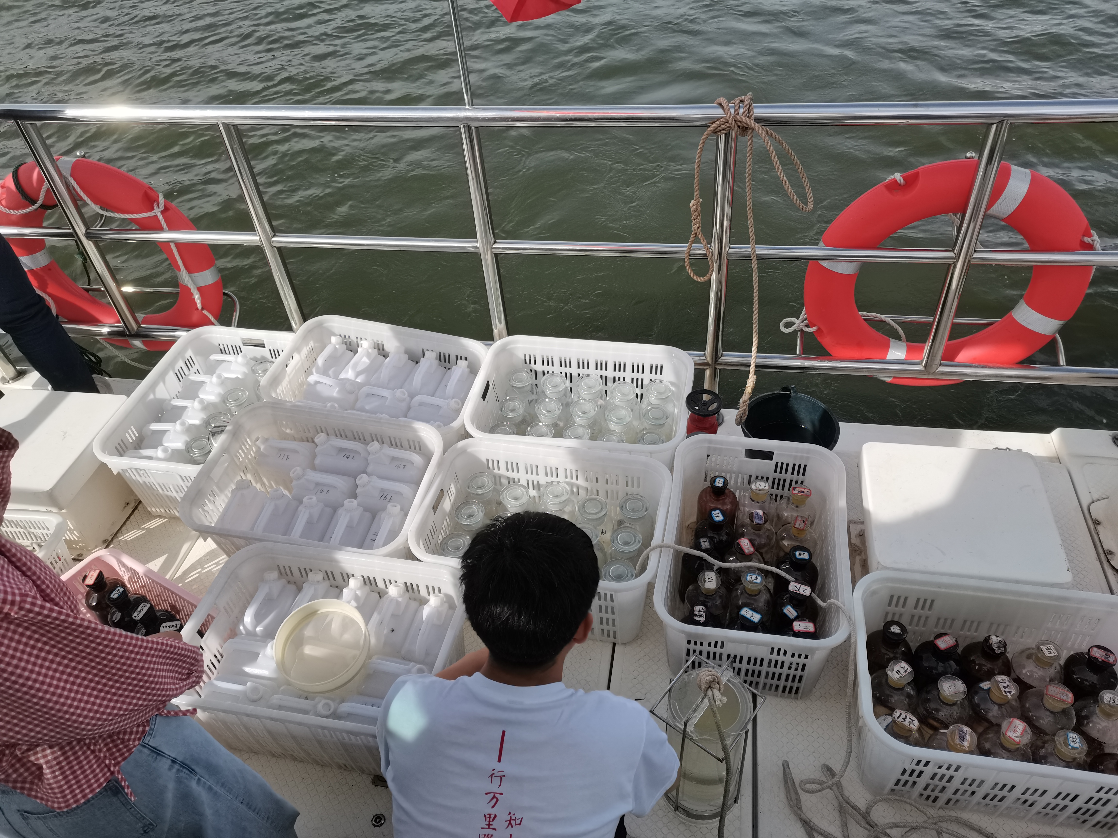 团队成员们向专业采样人员学习采样技术,在科研人员的指导下,利用自己的专业知识,理论与实践相结合,跟随着船只的节奏进行采样并在船上完成部分指标的检测。每个取样点分别取上层水和下层水,在现场进行了水温、浊度、pH、DO、藻类丰富度以及大气压等的检测,整个采样过程持续了3个多小时。
