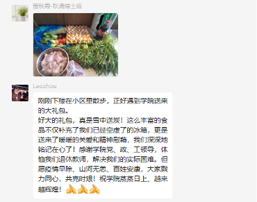 教职工们纷纷点赞:感谢学院工会的关怀与爱护!并表示,会继续积极配合防疫措施,安心居家办公,相信通过大家的共同努力,一定能够打赢这场疫情防控阻击战,早日回归明媚如初的校园!