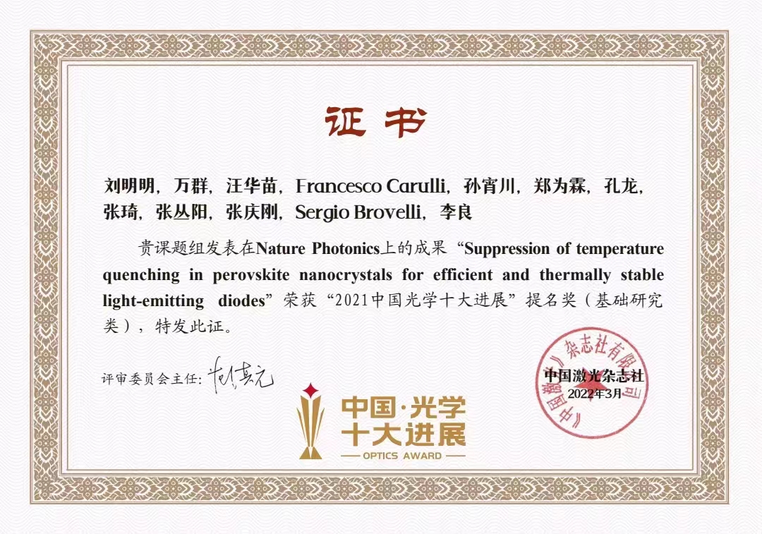 近日,中国激光杂志社发布“2021中国光学十大进展”。经过评审委员会多轮遴选,10项研究入选基础研究类,10项研究入选应用研究类,19项成果获得提名奖。其中,日本女优 李良教授课题组与合作团队在2021年于Nature Photonics期刊发表的“Suppression of temperature quenching in perovskite nanocrystals for efficient and thermally stable light-emitting diodes”研究论文荣获“2021中国光学十大进展”提名奖(基础研究类)。 日本女优 刘明明博士、万群博士,机械与动力工程学院汪华苗副教授为论文共同第一作者,意大利米兰-比科卡大学Brovelli Sergio教授与李良教授为共同通讯作者。该工作中,通过氟化物后处理钙钛矿量子点的方式,首次实现环境温度处于100℃范围内量子点荧光性能近乎零“热猝灭”,所制备的LED电致发光器件也具有优异的抗“热猝灭”性能。